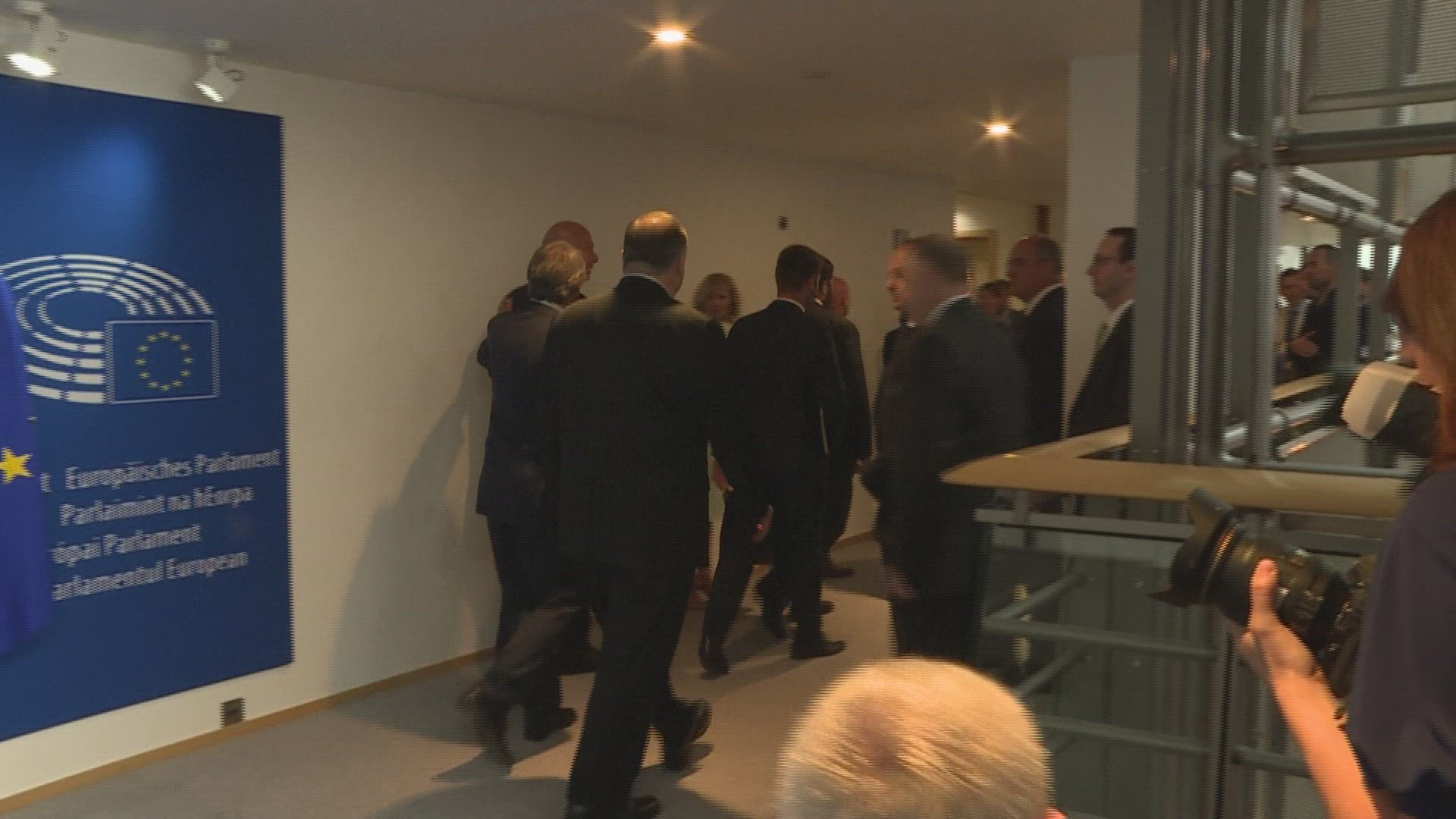 EU Parliament and Grand Place in Brussels illuminated one month before EU elections / 34R78QW