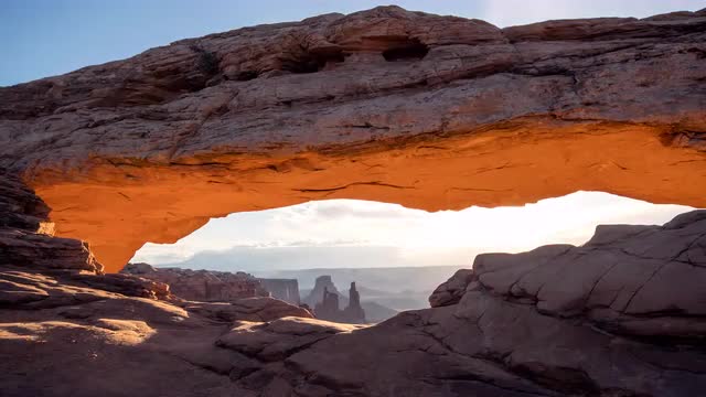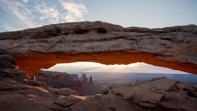 Desert sunrise landscape through the natural sandstone Mesa Arch, Utah, USA
