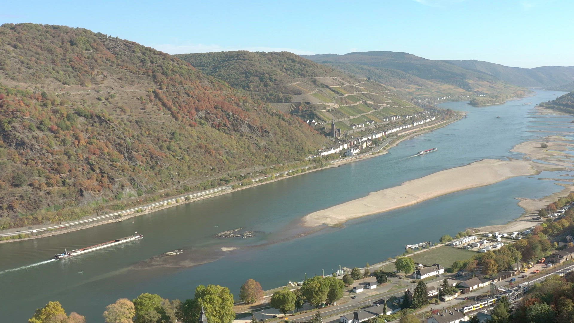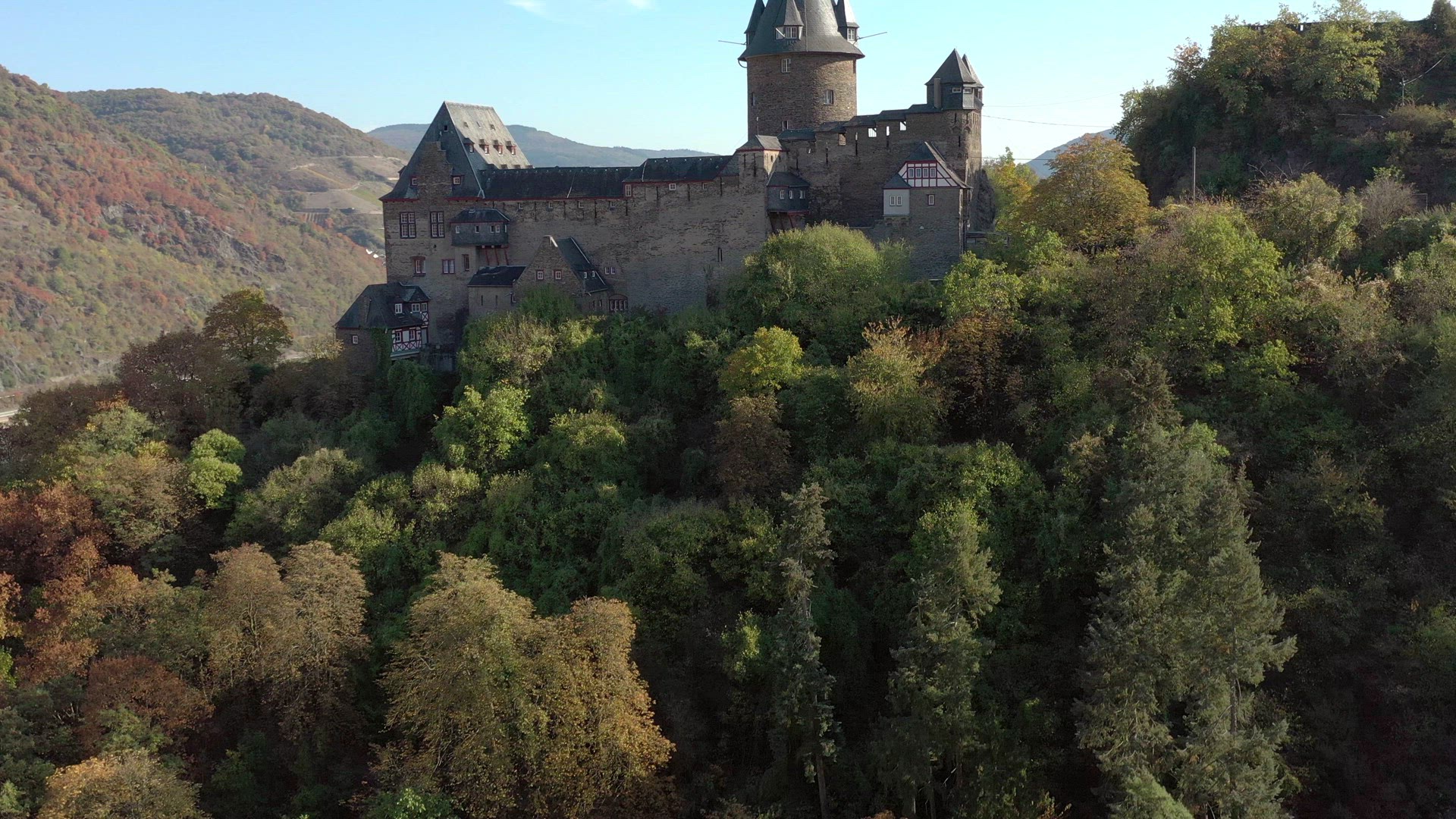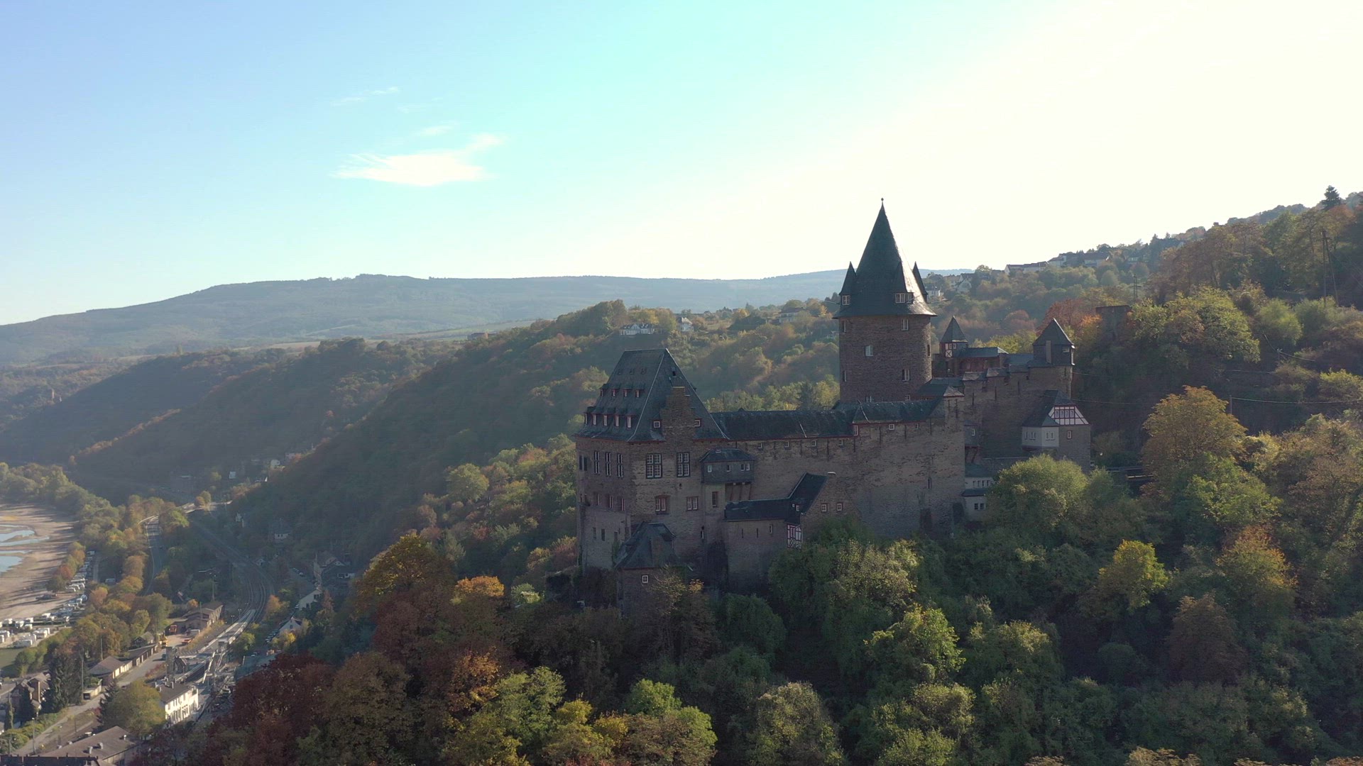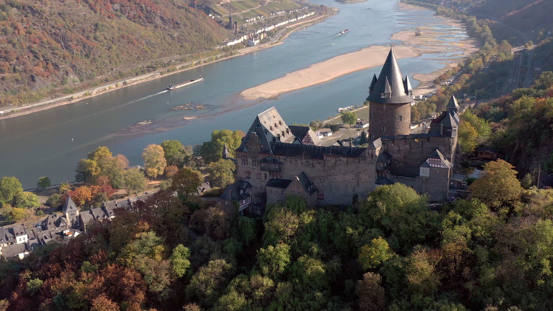 Aerial view of the German town of Bacharach on the shores of the River Rhine an 11th century settlement in Western Germany. A popular tourist destination for local architecture and fine local wines produced from the vineyards in a valley.