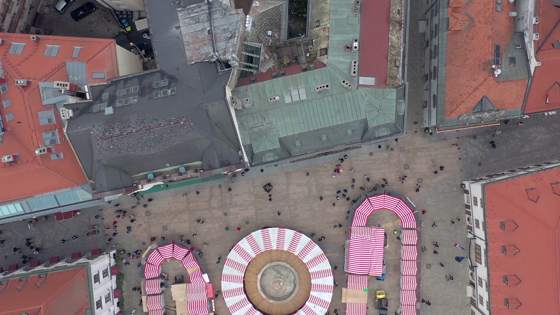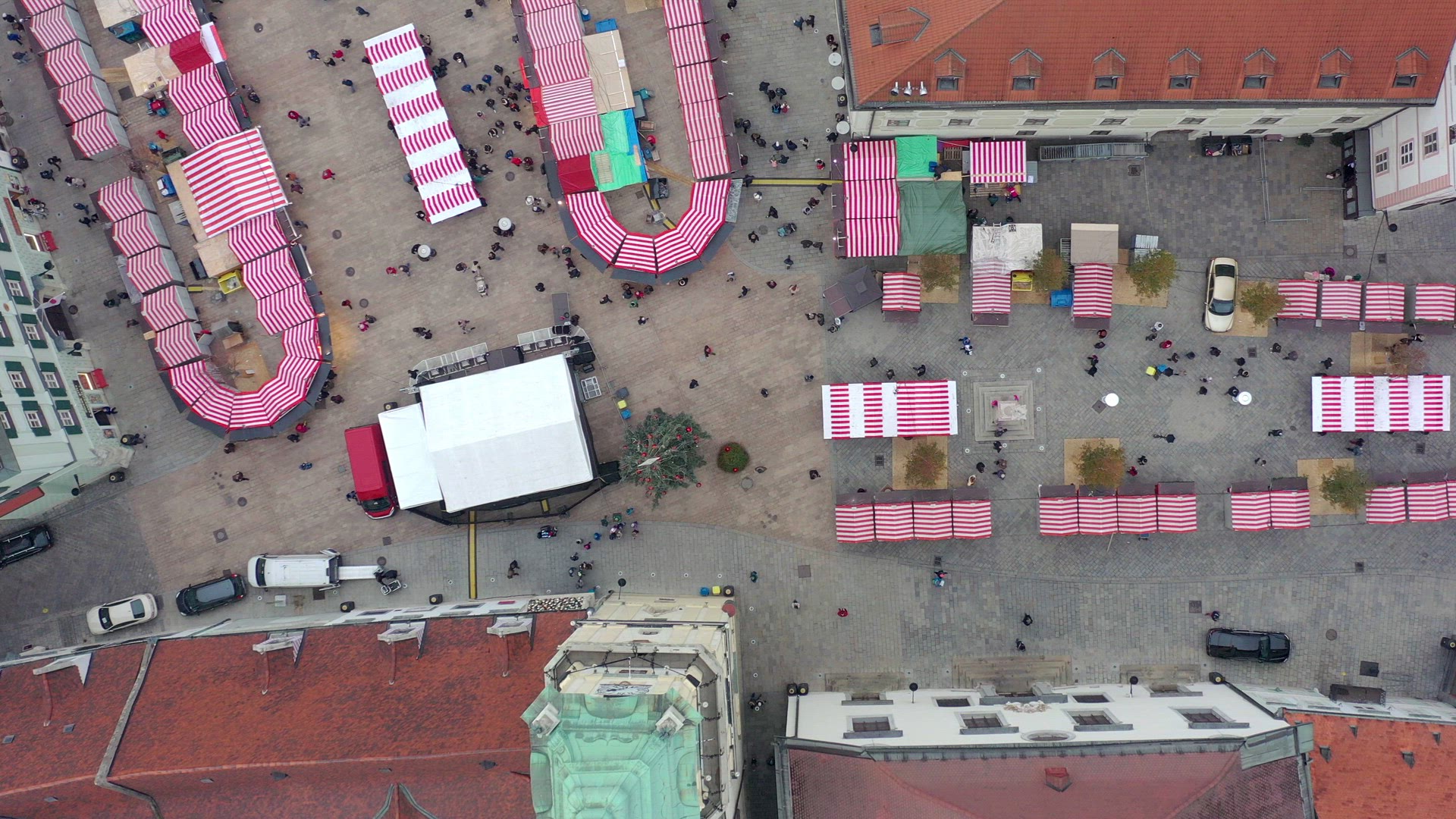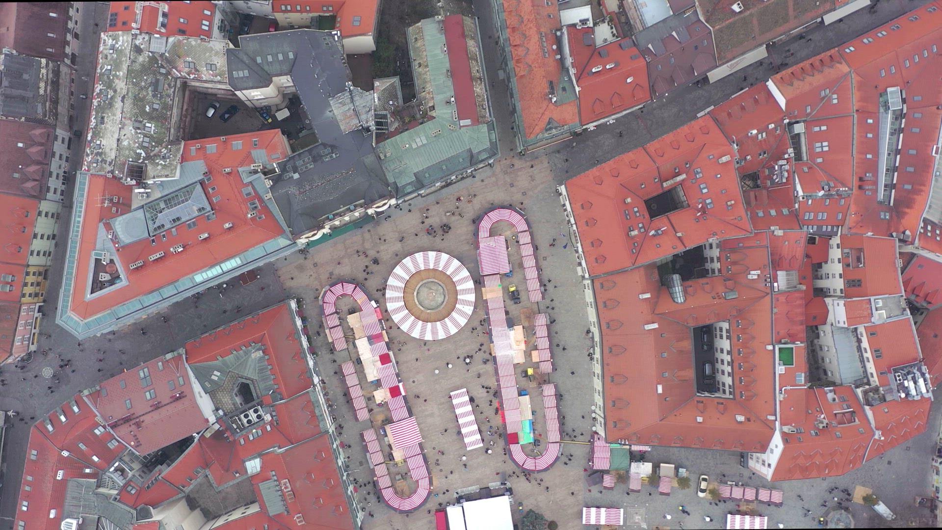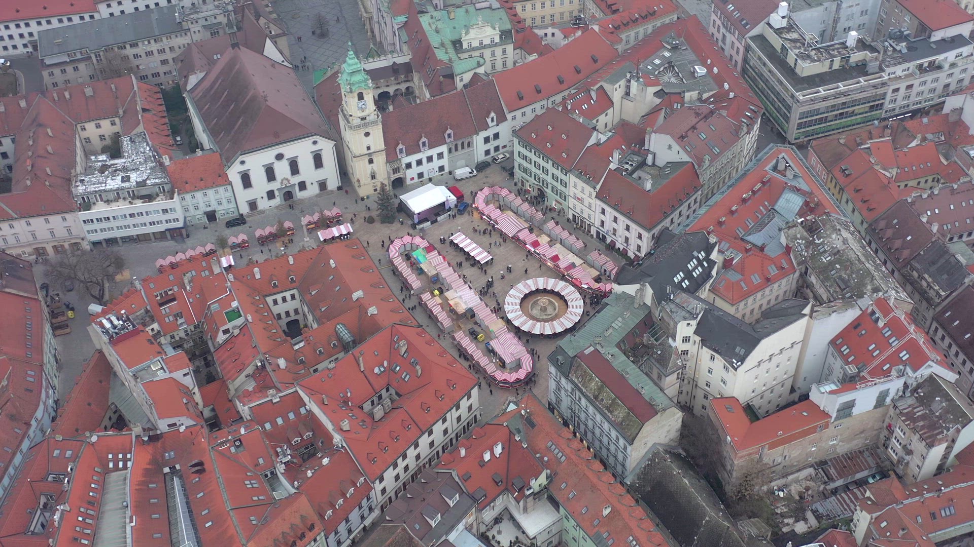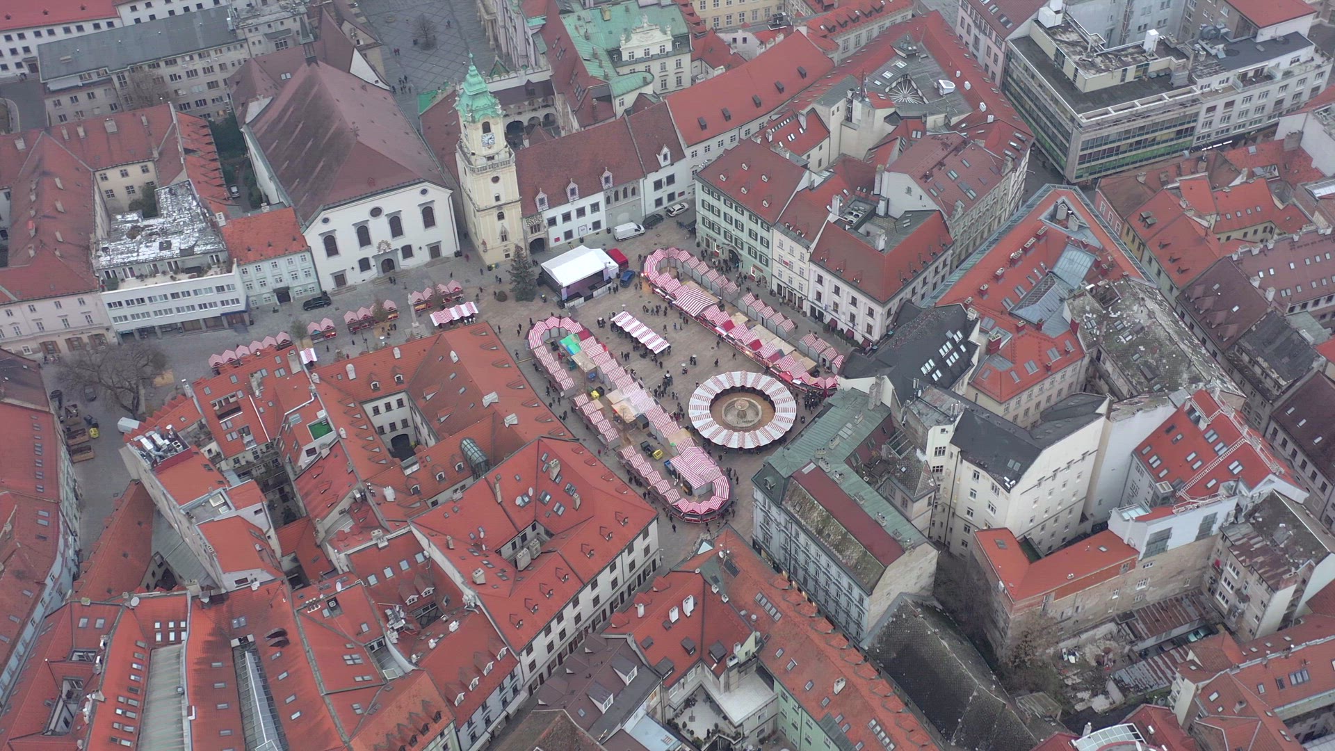 A Christmas market seen in Bratislava in Slovakia is seen from the air with shops and stalls selling food and festive souvenirs for adults and children. There are hundreds of people attending the family event
