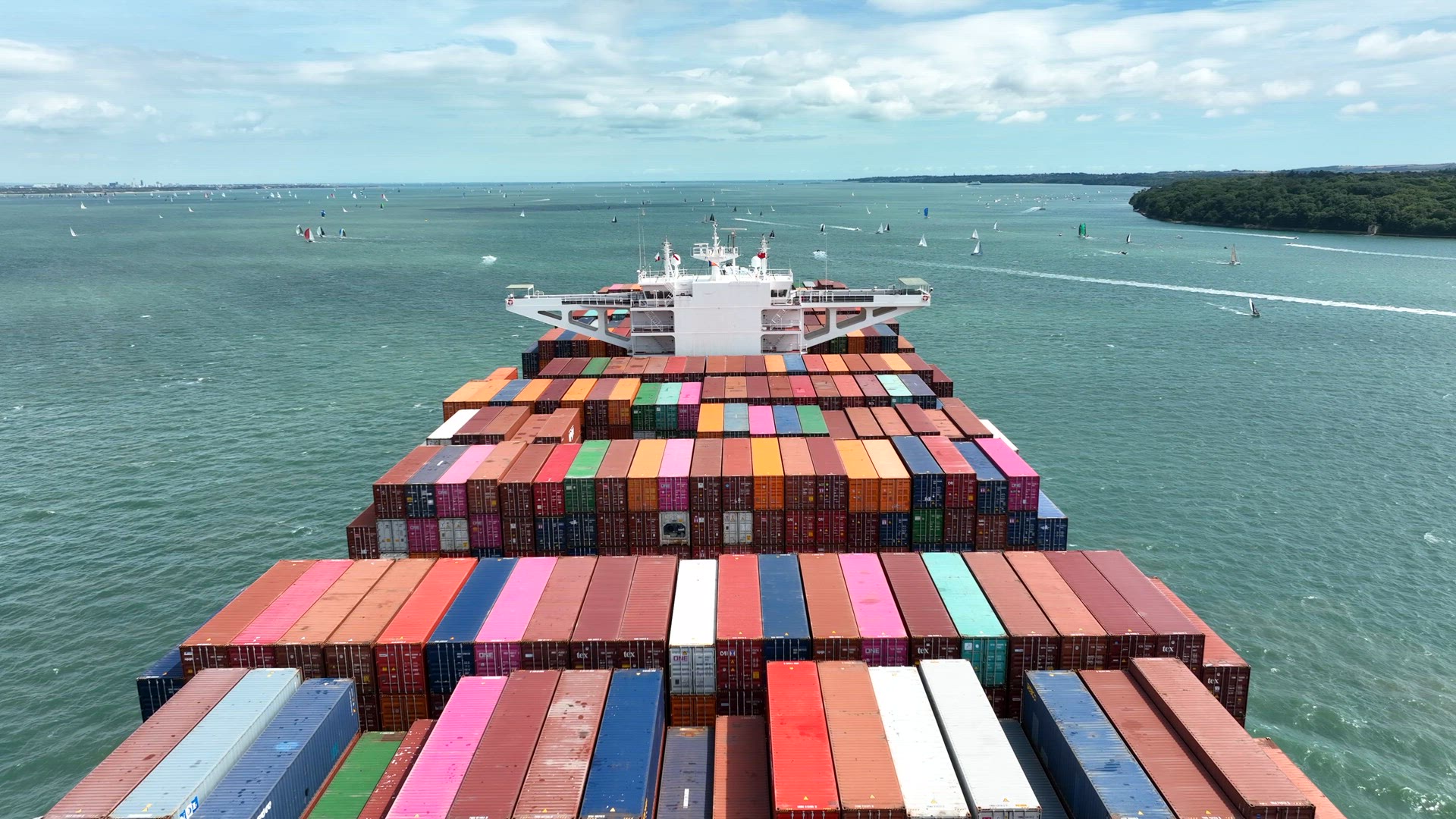 > Fully Loaded Container Ship at Sea Transporting Cargo Around the World