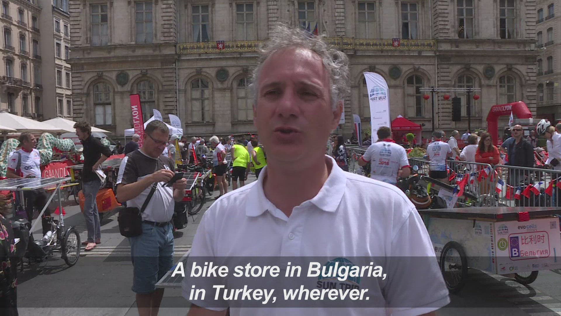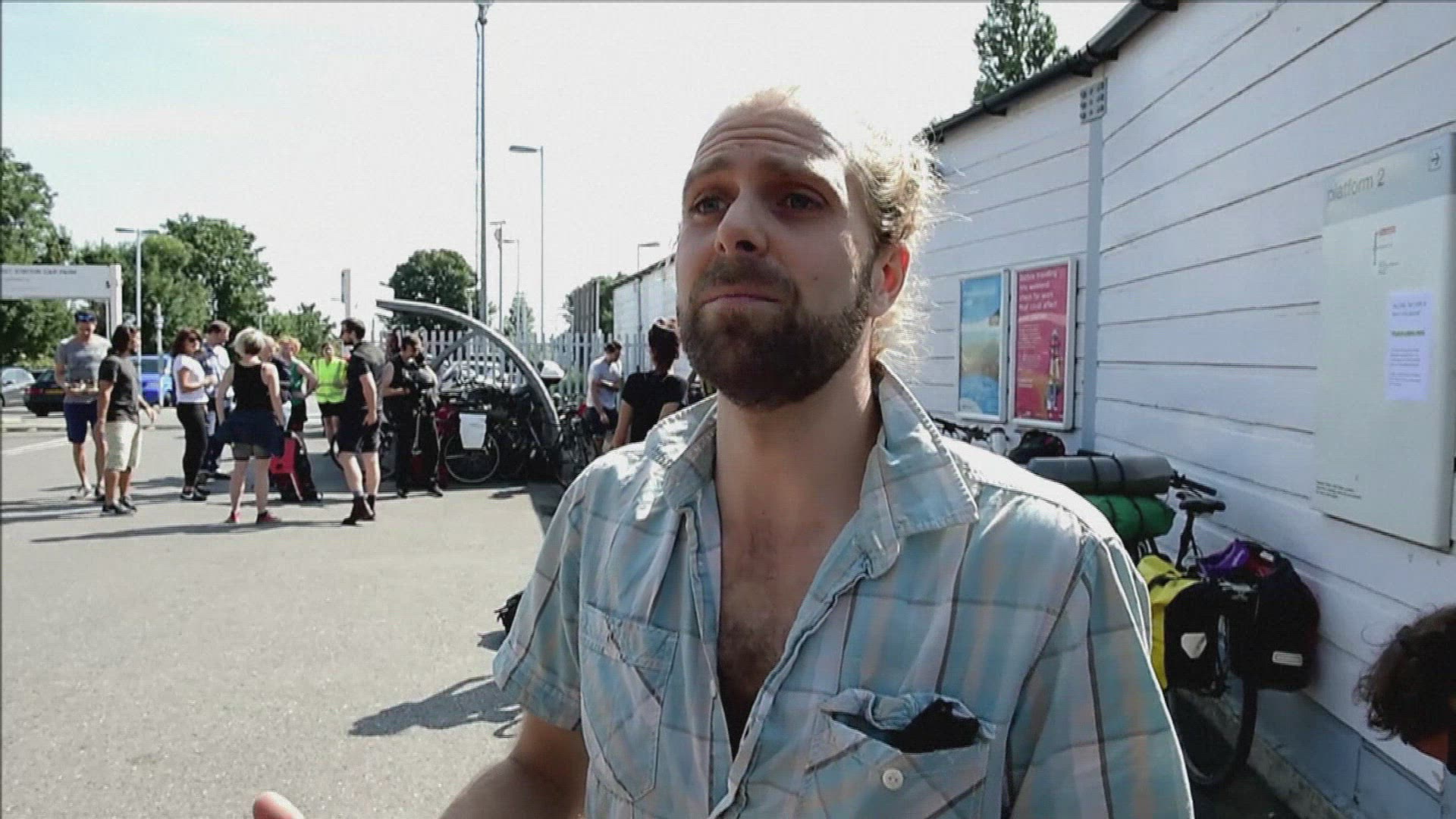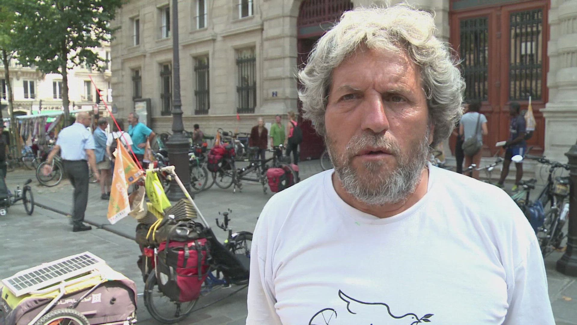 Cyclists on a path alongside vehicles driving on a road seen from a bird's eye view.