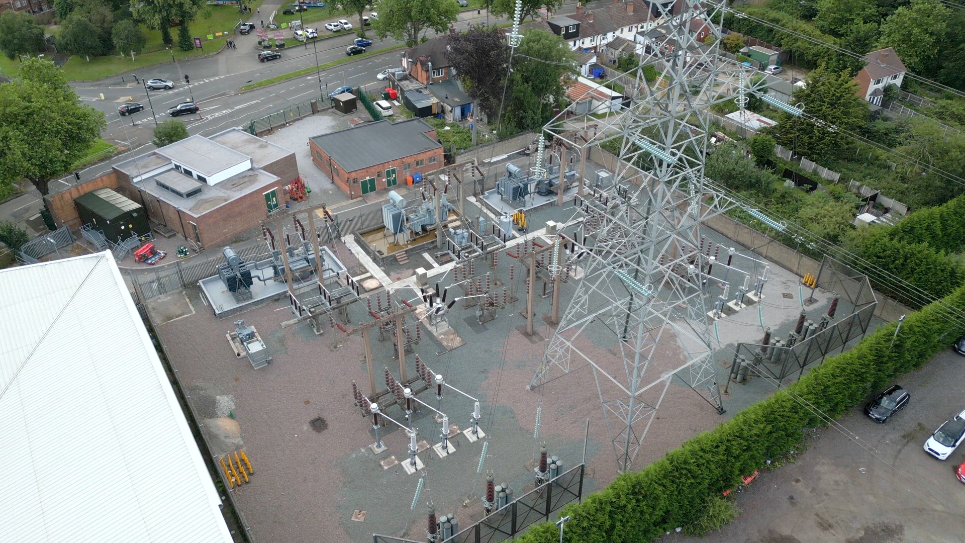 Aerial view of a high voltage electrical substation and pylon supplying electricity to an urban area. The substation takes extremely high voltage electricity and steps down for distribution to houses and businesses.
