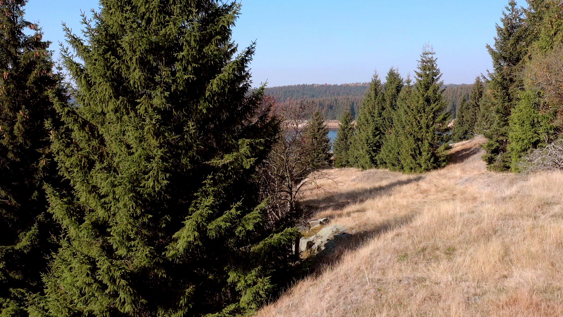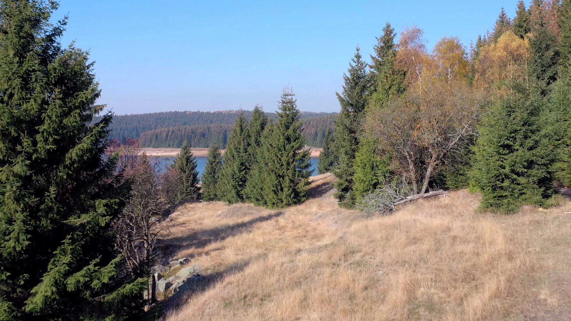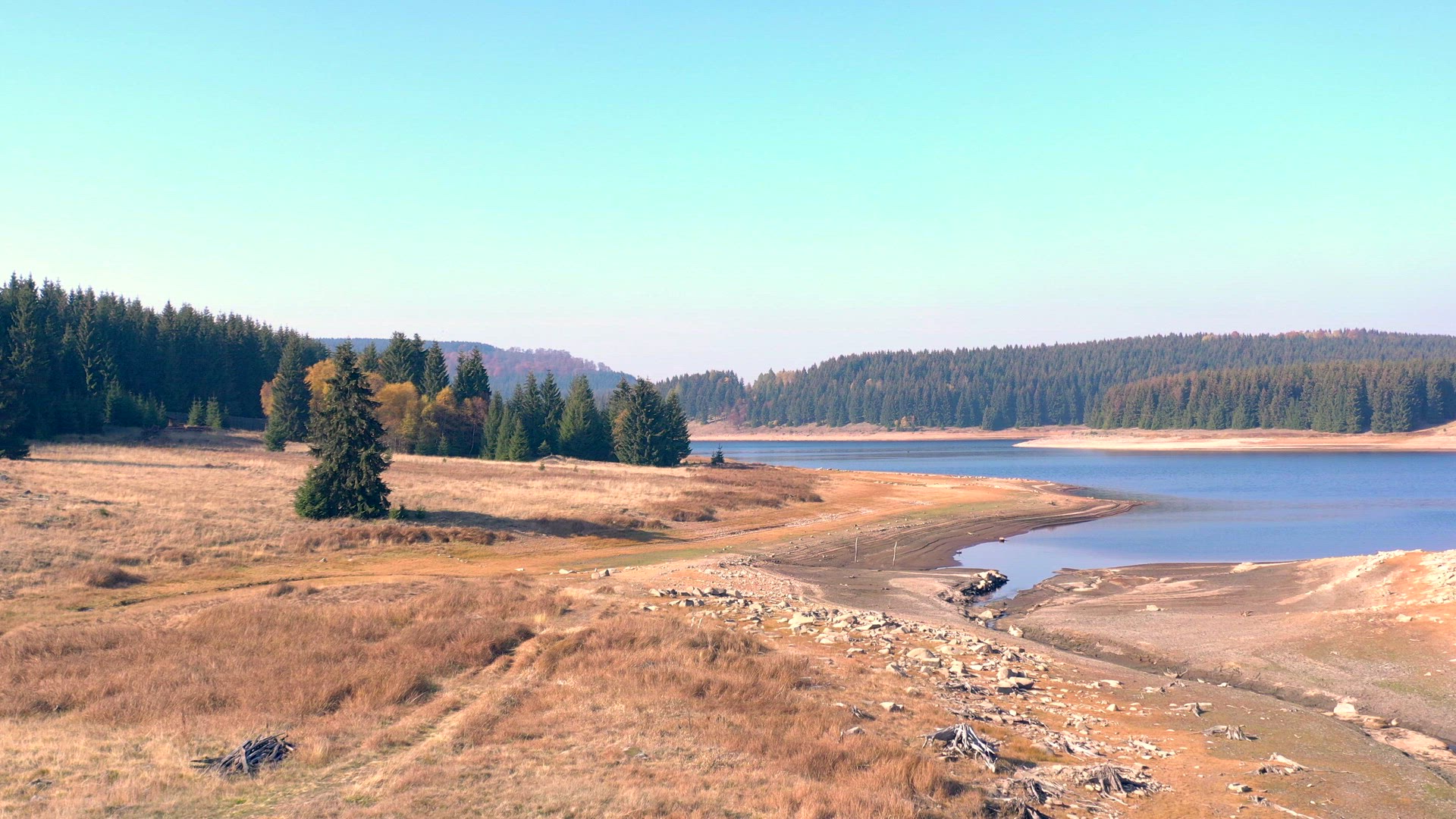A Reservoir in the Czech Republic and bordering with Germany the Flaje Water reservoir provides electricity and water to the local area and is a beautiful lake surrounded by evergreen trees high in the mountains.