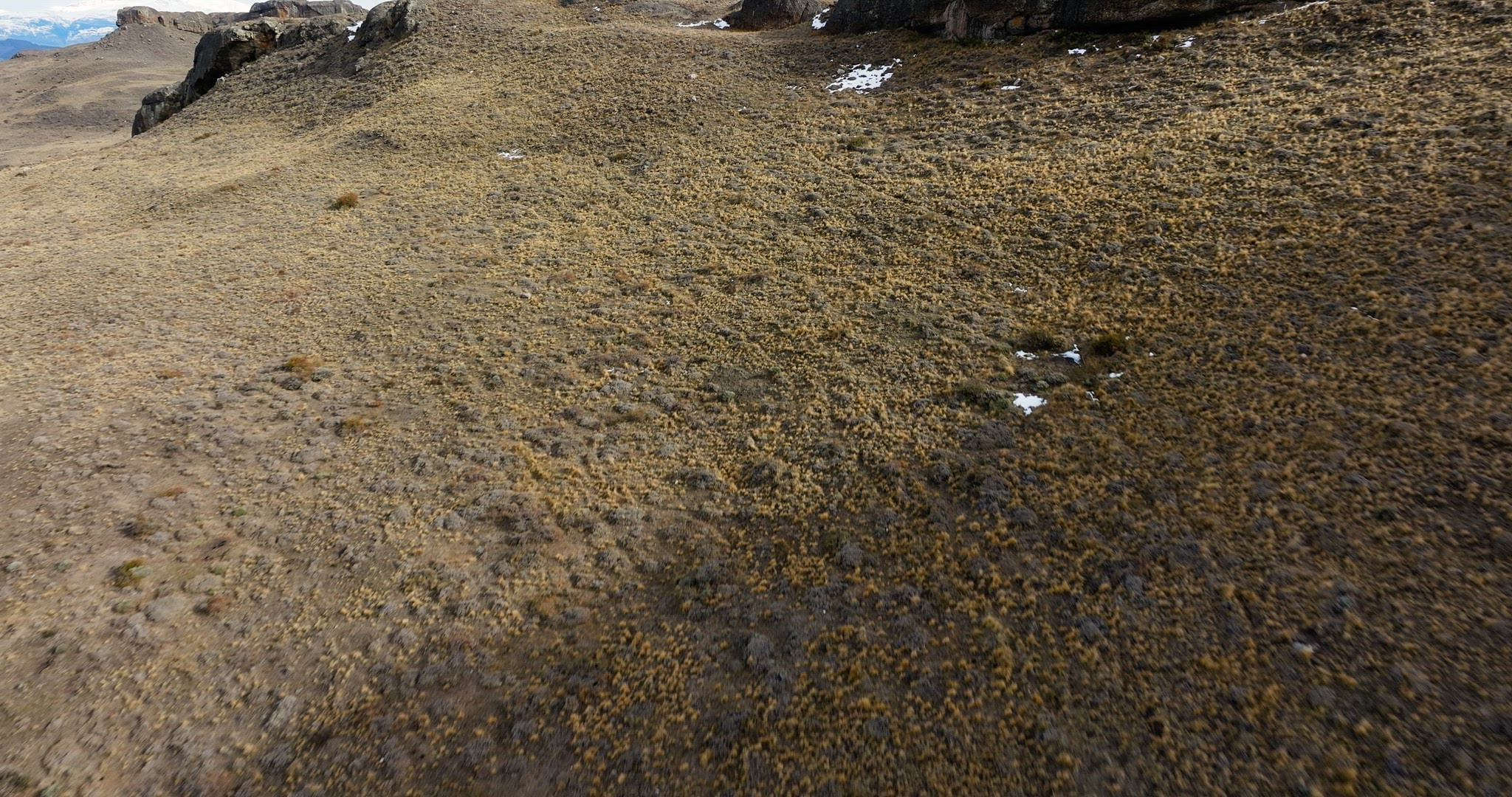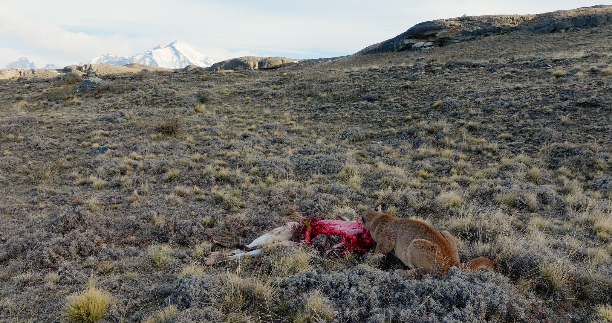 Discover an aerial pan and track in Patagonia near Torres del Paine, Chile. A puma cub drinks from a partially frozen puddle, then moves on, in a rugged landscape. The drone moves left while the camera pans right.