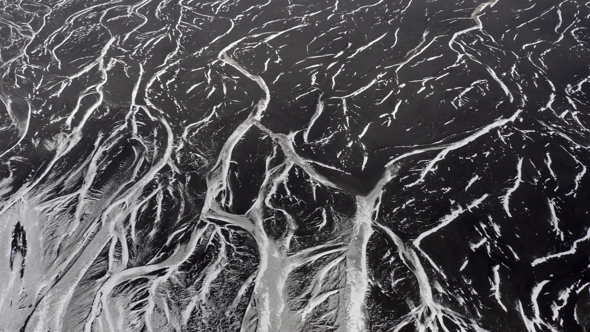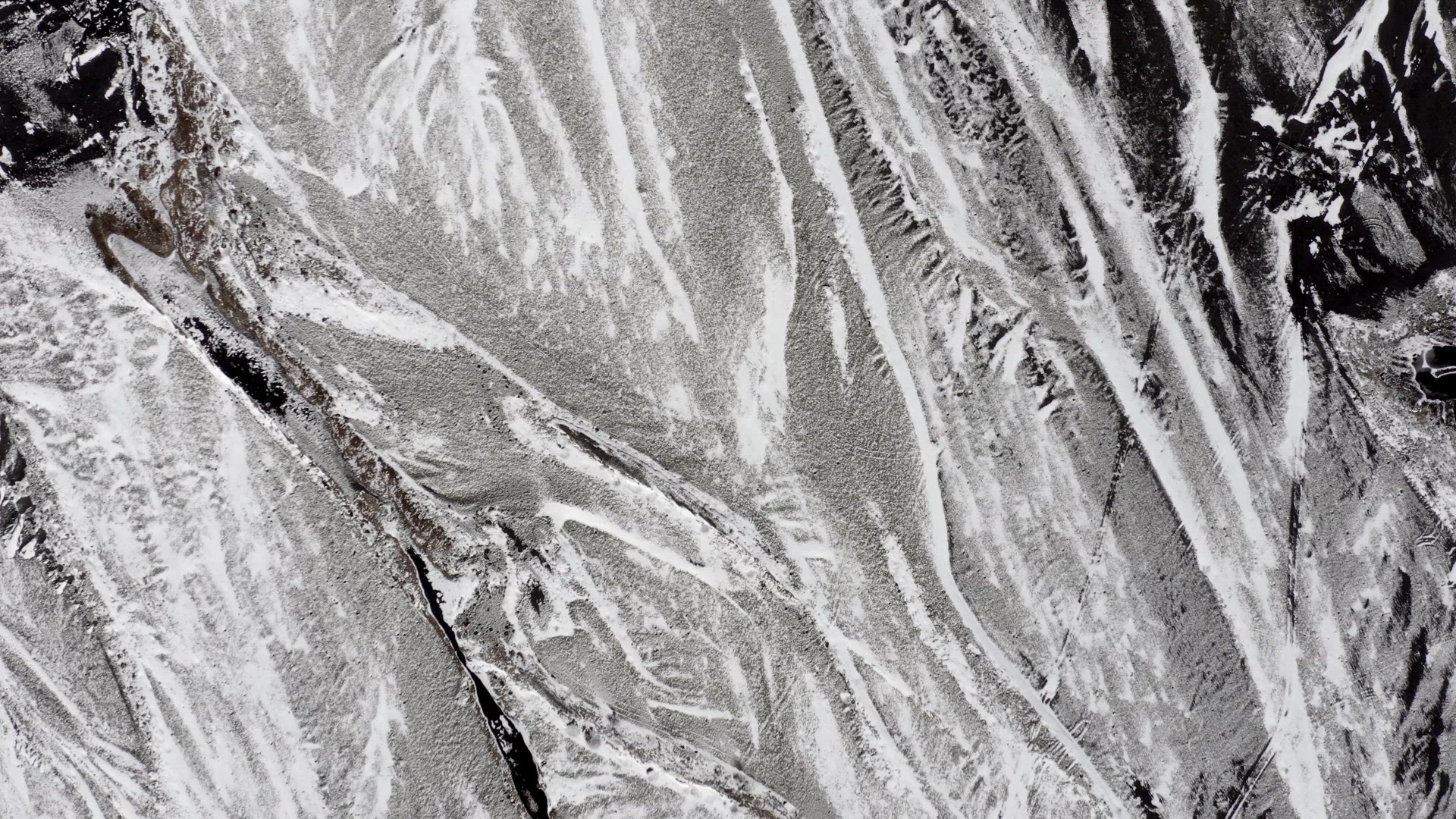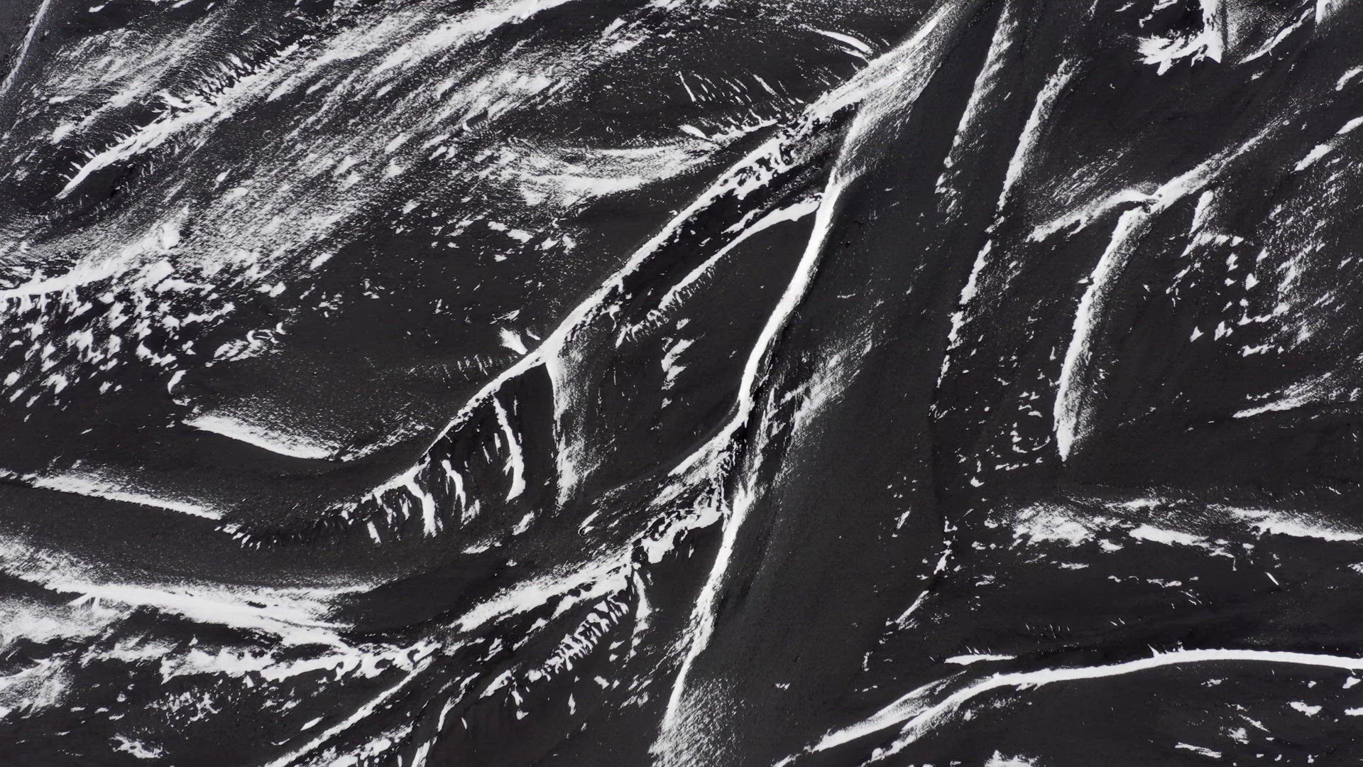 Aerial view of the unique views over Iceland. The volcanic rock and sand covered with snow creates a martian landscape which is barren and deserted, creating beautiful patterns when seen from high up.