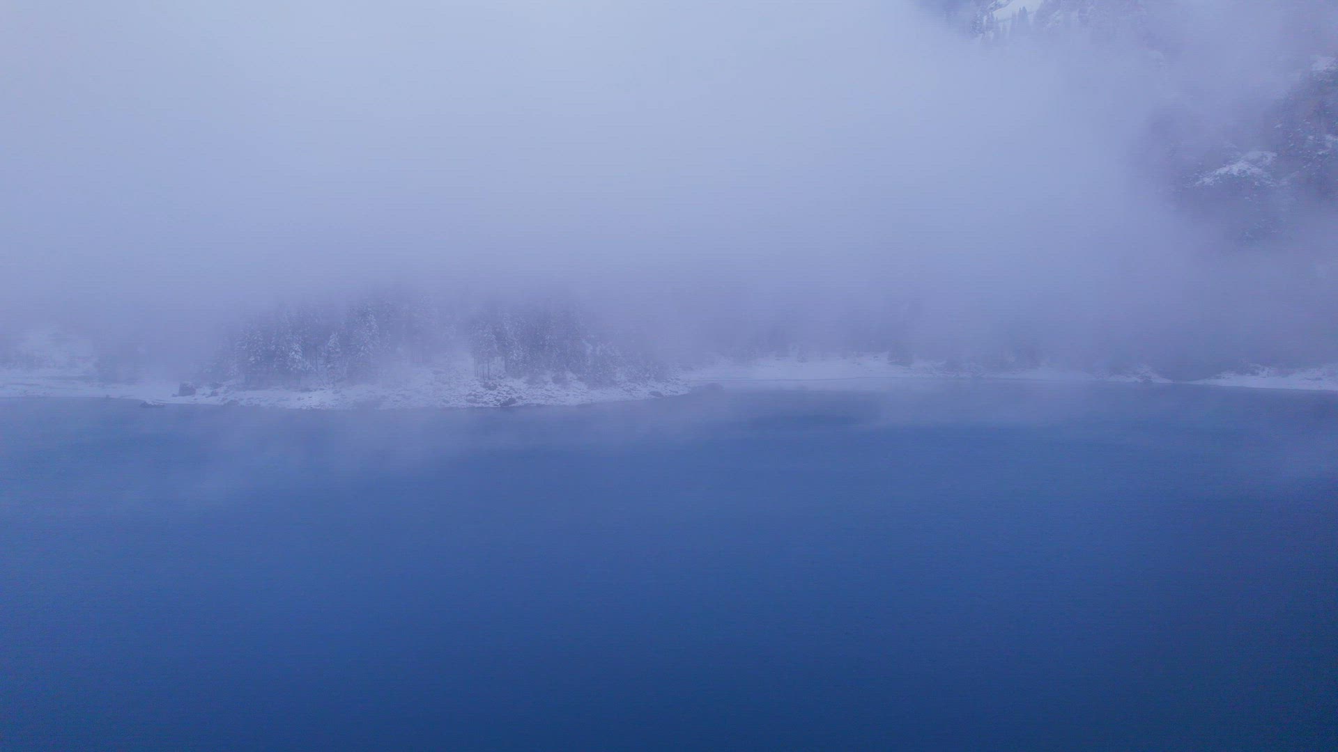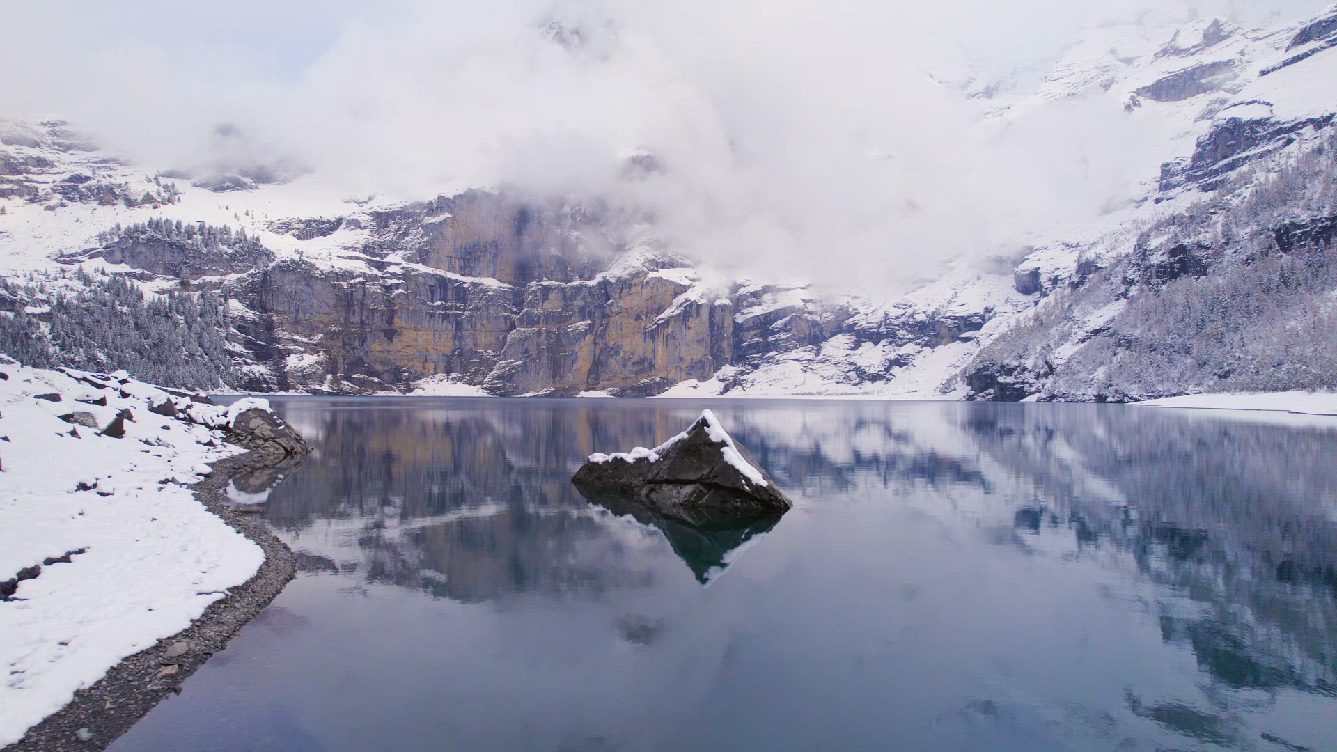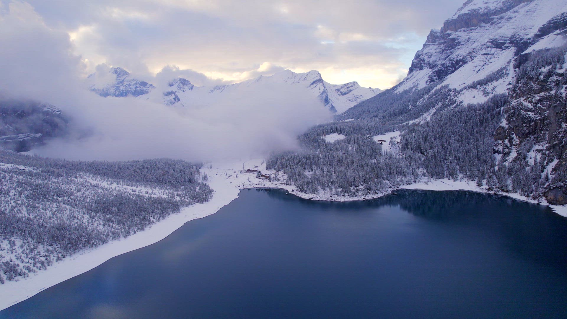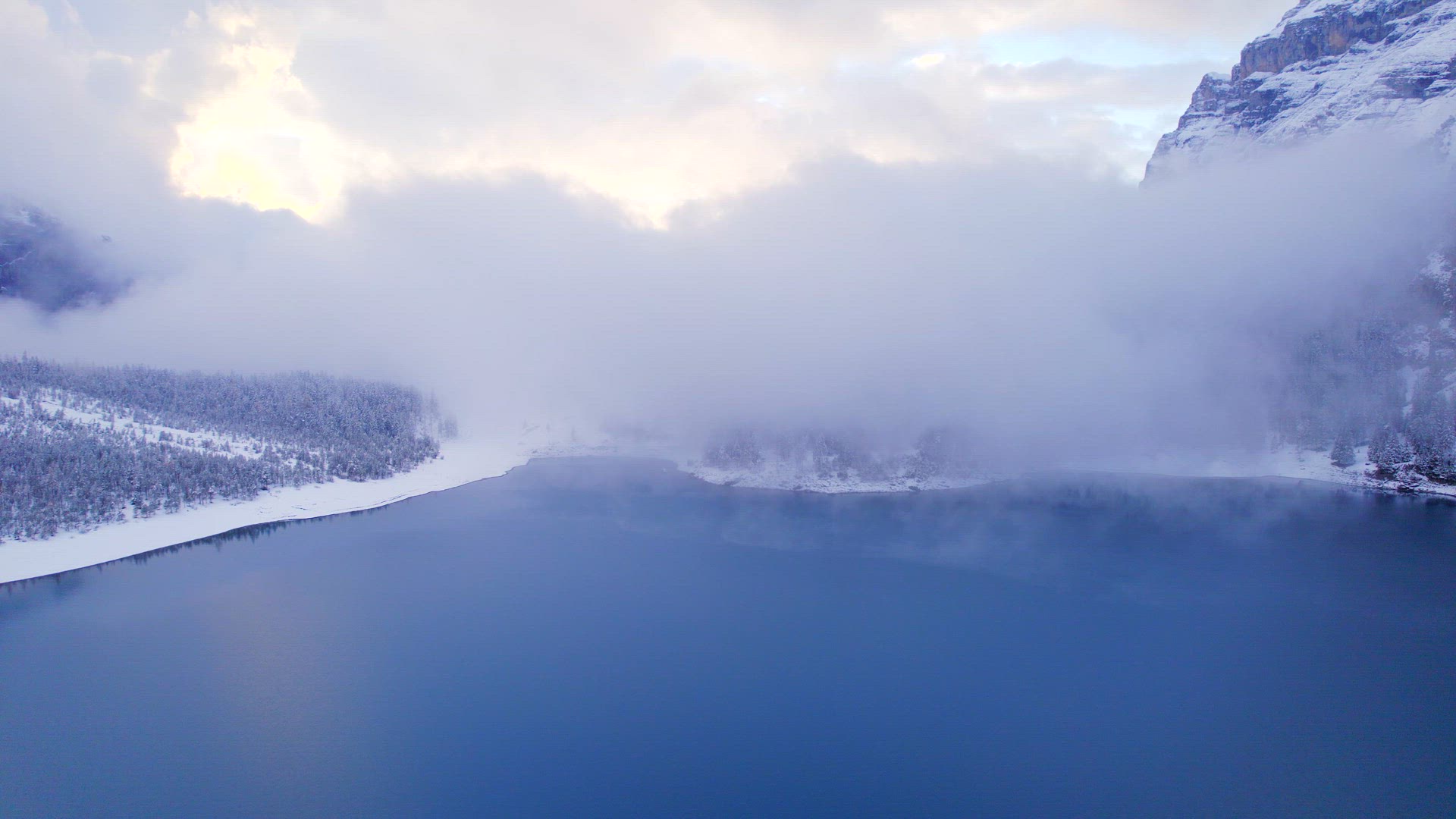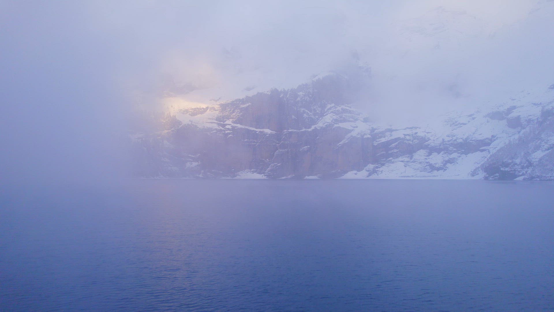 > Oeschinen Lake in the Snowy Mountains of Switzerland on a Foggy Morning