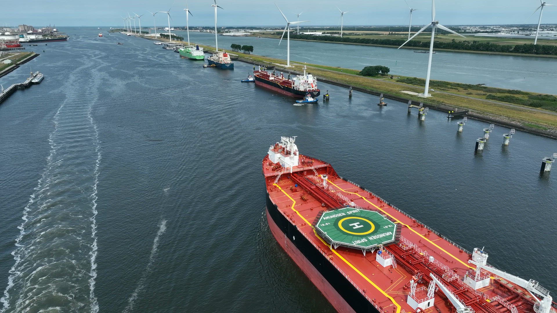 Oil tanker ships traverse the port of Rotterdam laden with oil and petrochemicals for global transport and fuel services.