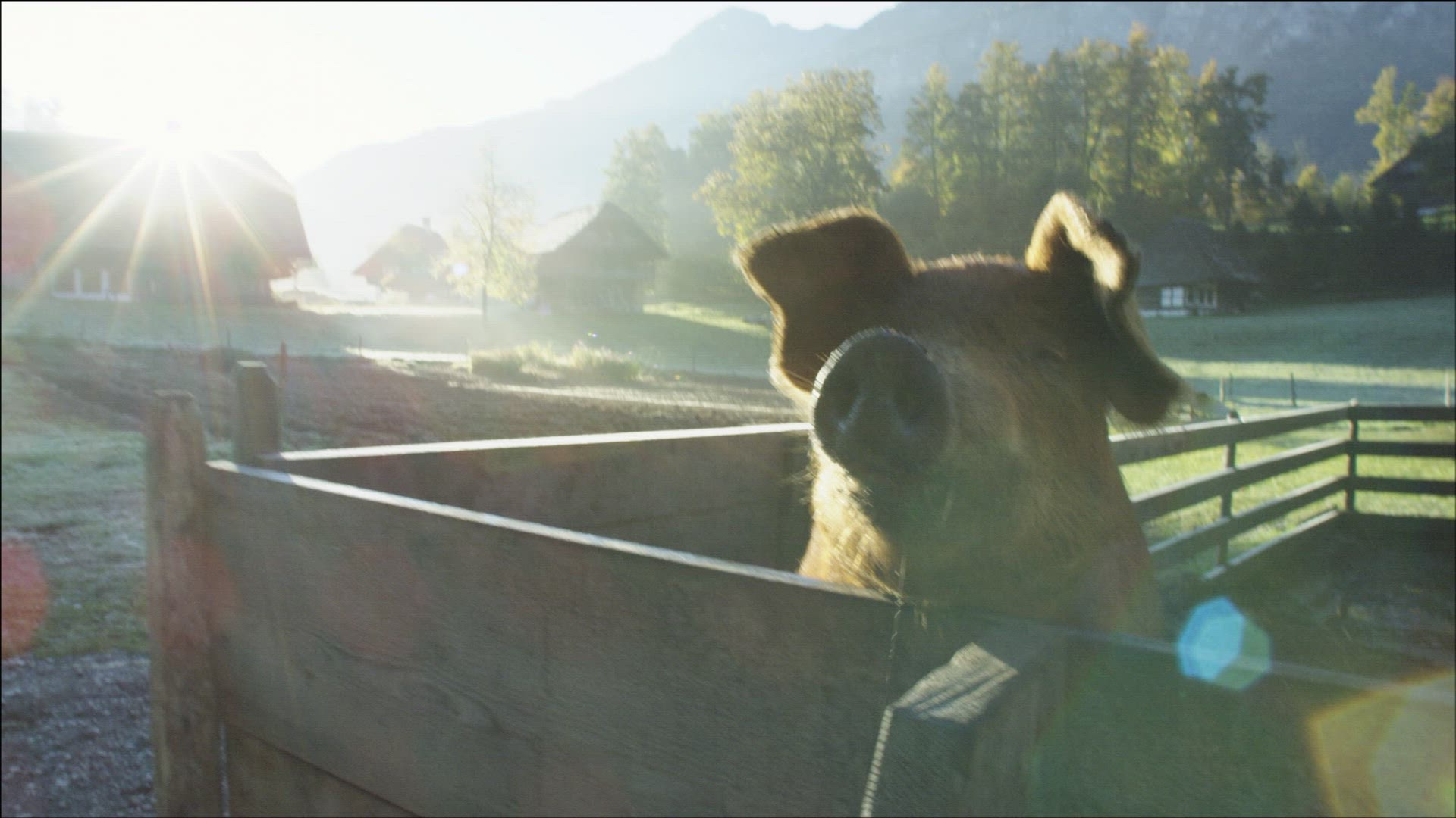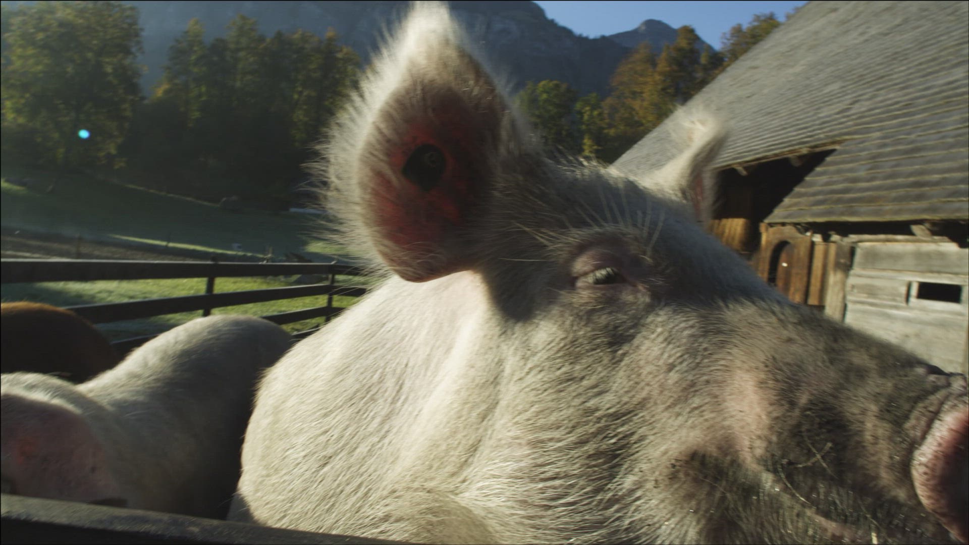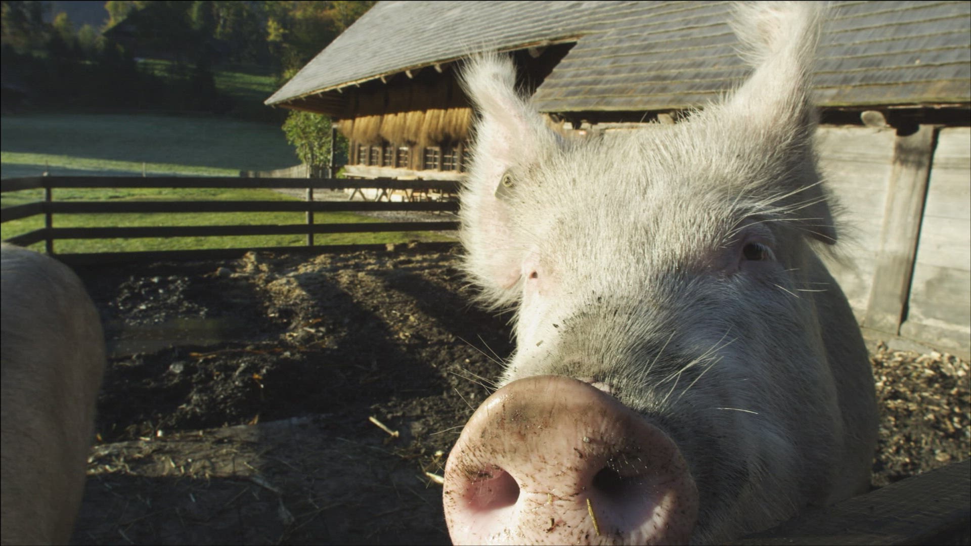 A pig farm in the English countryside, where pigs are reared and given outdoor space to roam and eat which is beneficial for their growth and quality of meat
