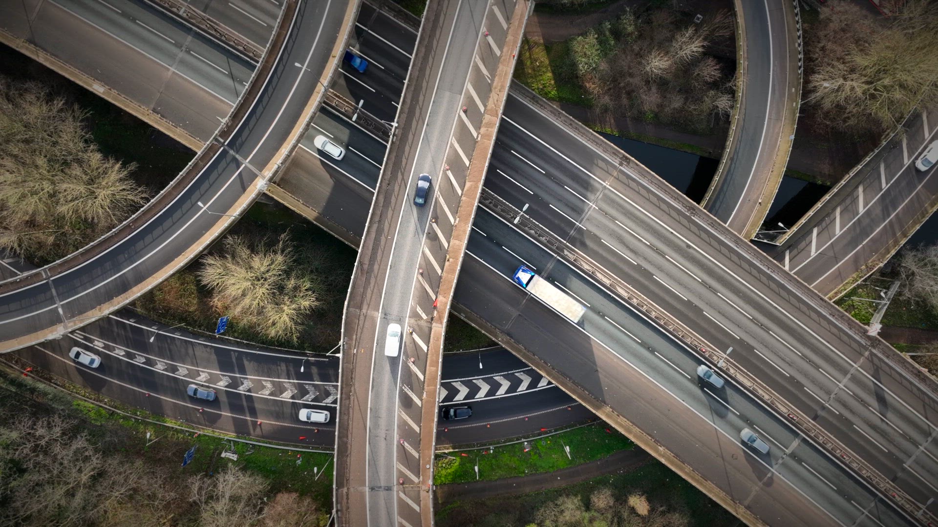 Aerial shot of one of the most complex and iconic road interchanges in the United Kingdom, Spaghetti Junction. The intricate network of roads and bridges that make up the interchange, showcasing the scale and engineering of the structure from an aerial view. The footage captures the flow of traffic as cars and trucks navigate the winding roads, highlighting the busy nature of the junction