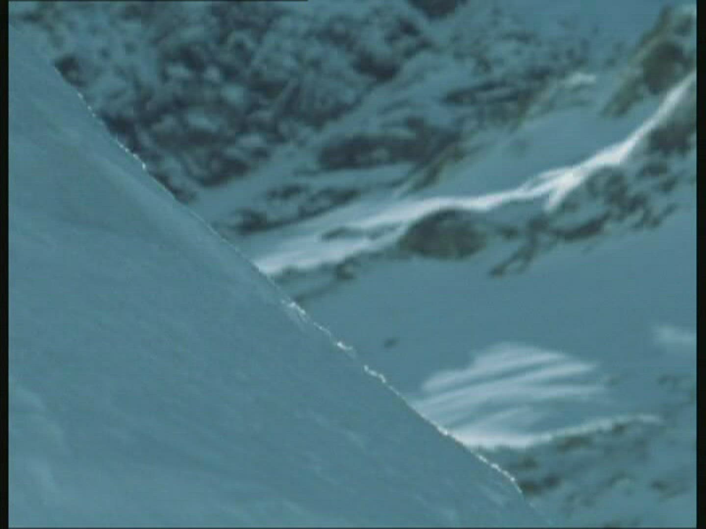 An aerial flight past a large peak and showing a small skiing restaurant hidden behind the rock. In the distance skiers can be seen using a lift.