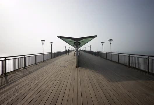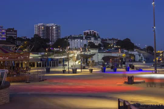 Aerial view of the pleasure beach and pier at Bournemouth beach in England. The beach is famous for being a UK tourist hotspot during the summer offering amusements and activities for families visiting the coast