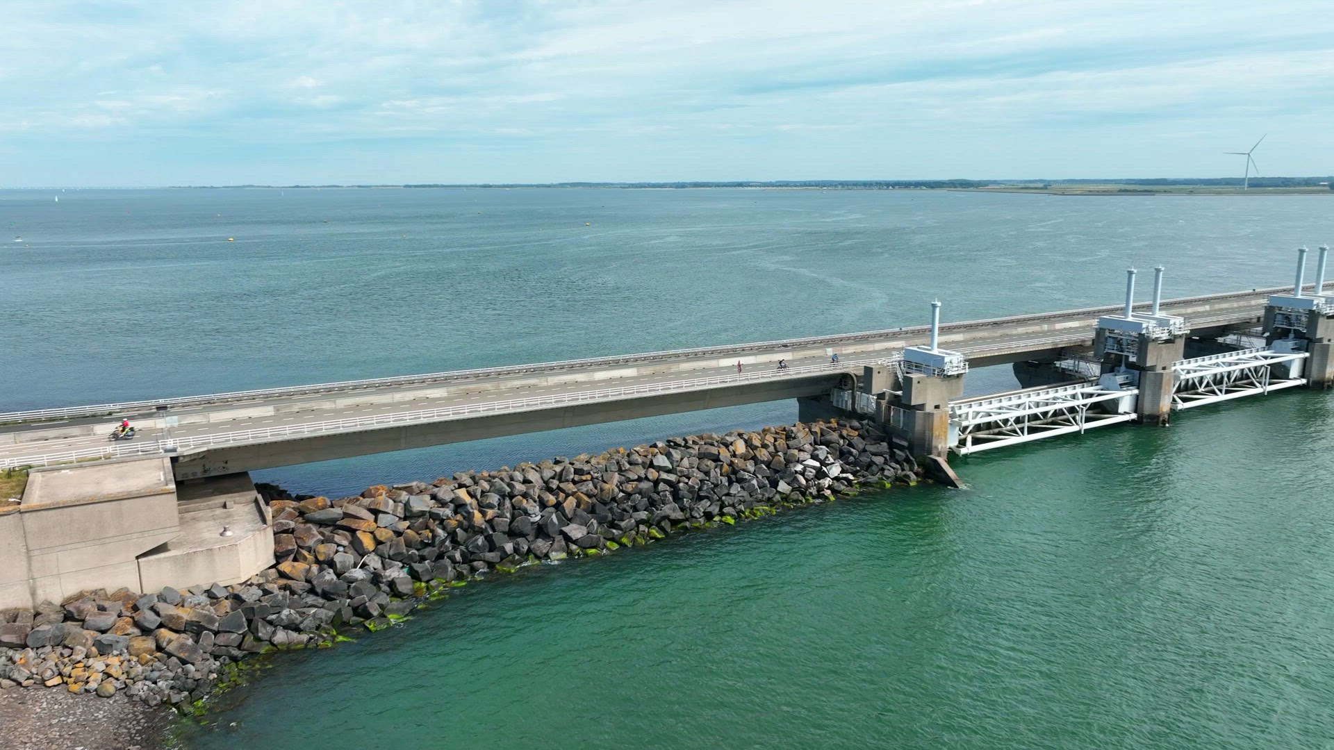 Aerial timelapse of the Zeeland Bridge. It is the longest bridge in the Netherlands. The bridge crosses the Oosterschelde estuary. It joins the islands of Schouwen-Duiveland and Noord-Beveland in Zeeland. The Zeeland Bridge took two years to build between 1963 and 1965.