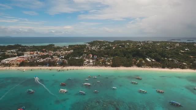 White sandy beach and blue turquoise pristine waters make up an awesome holiday background. Spectacular high aerial view nature landscape.