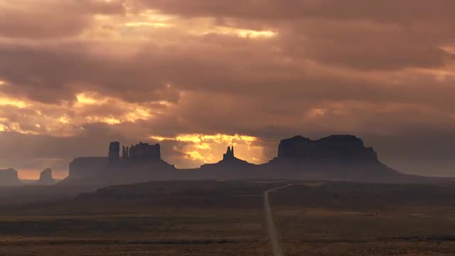 Time-lapse clouds over roads & cliff formations of Monument Valley, Arizona