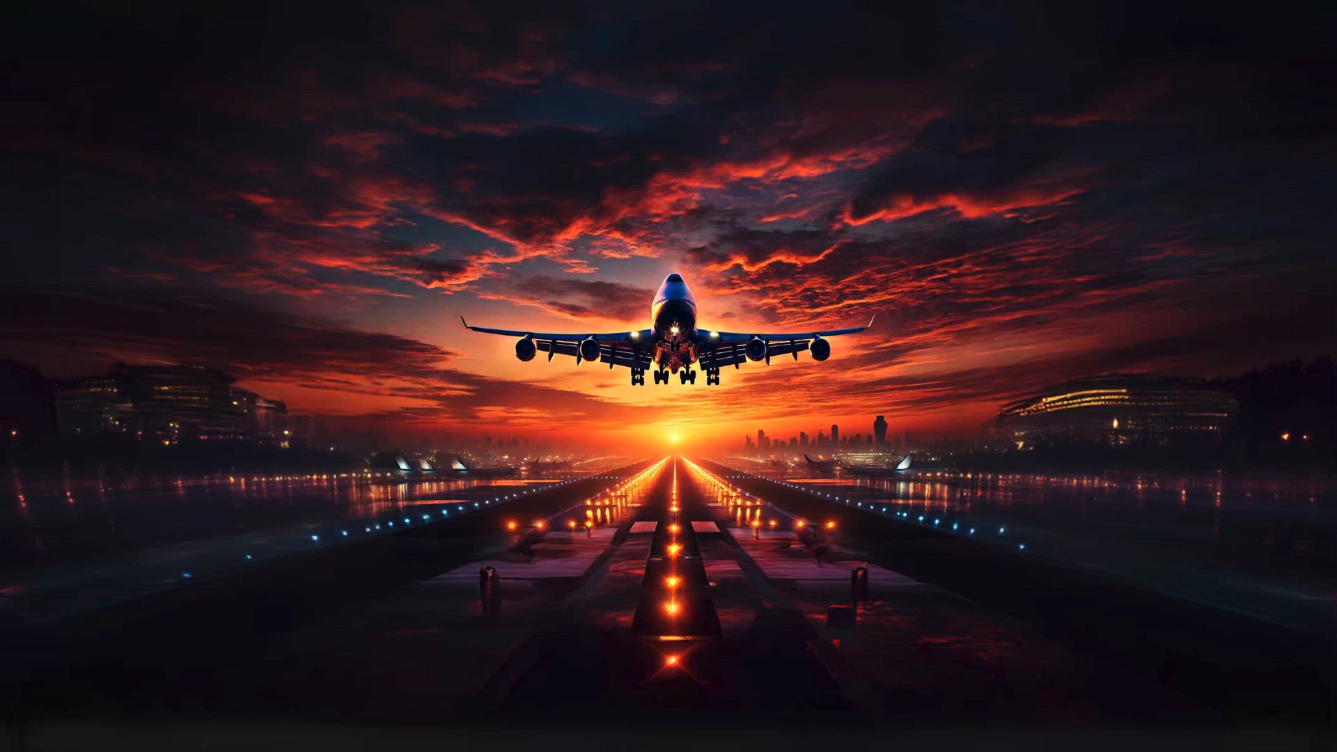 Airplane Landing at Sunset – Dramatic Runway Scene with Fiery Sky