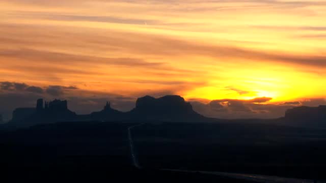 Time-lapse clouds at sunrise over roads & cliff formations of Monument Valley, Arizona