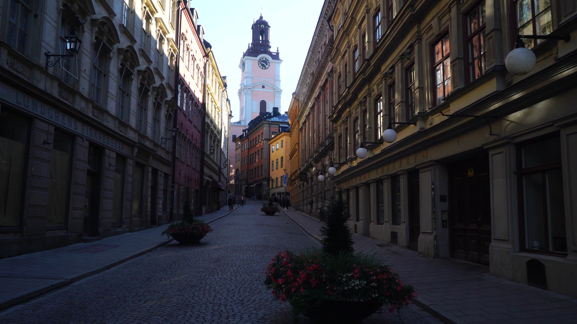 buildings in old town stockholm - tower of Storkyrkan in background - people walking on Västerlånggatan - low angle