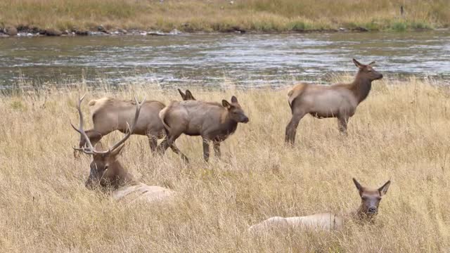 A large elk herd grazing on Antelope Flats below stormy spring skies. Grand Teton National Park, Wyoming