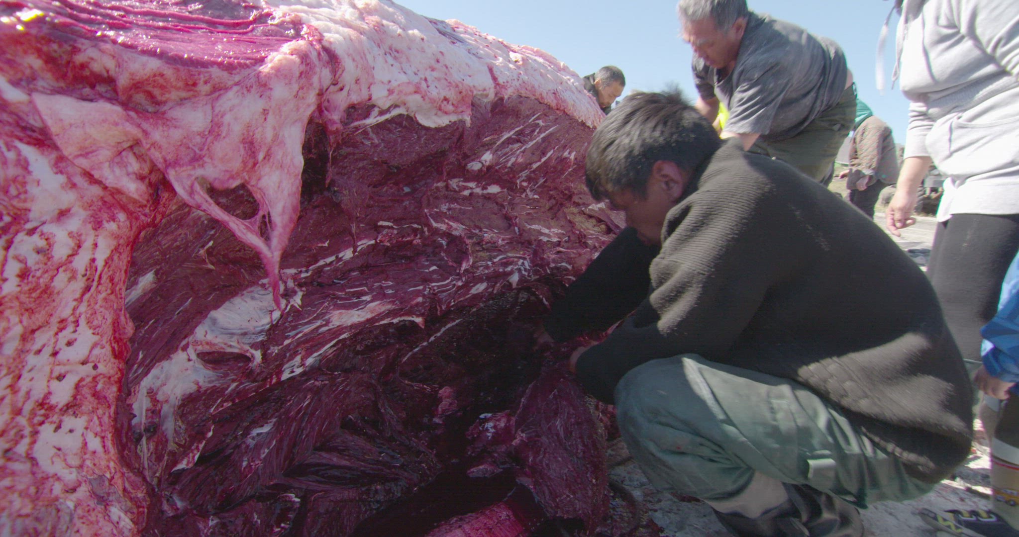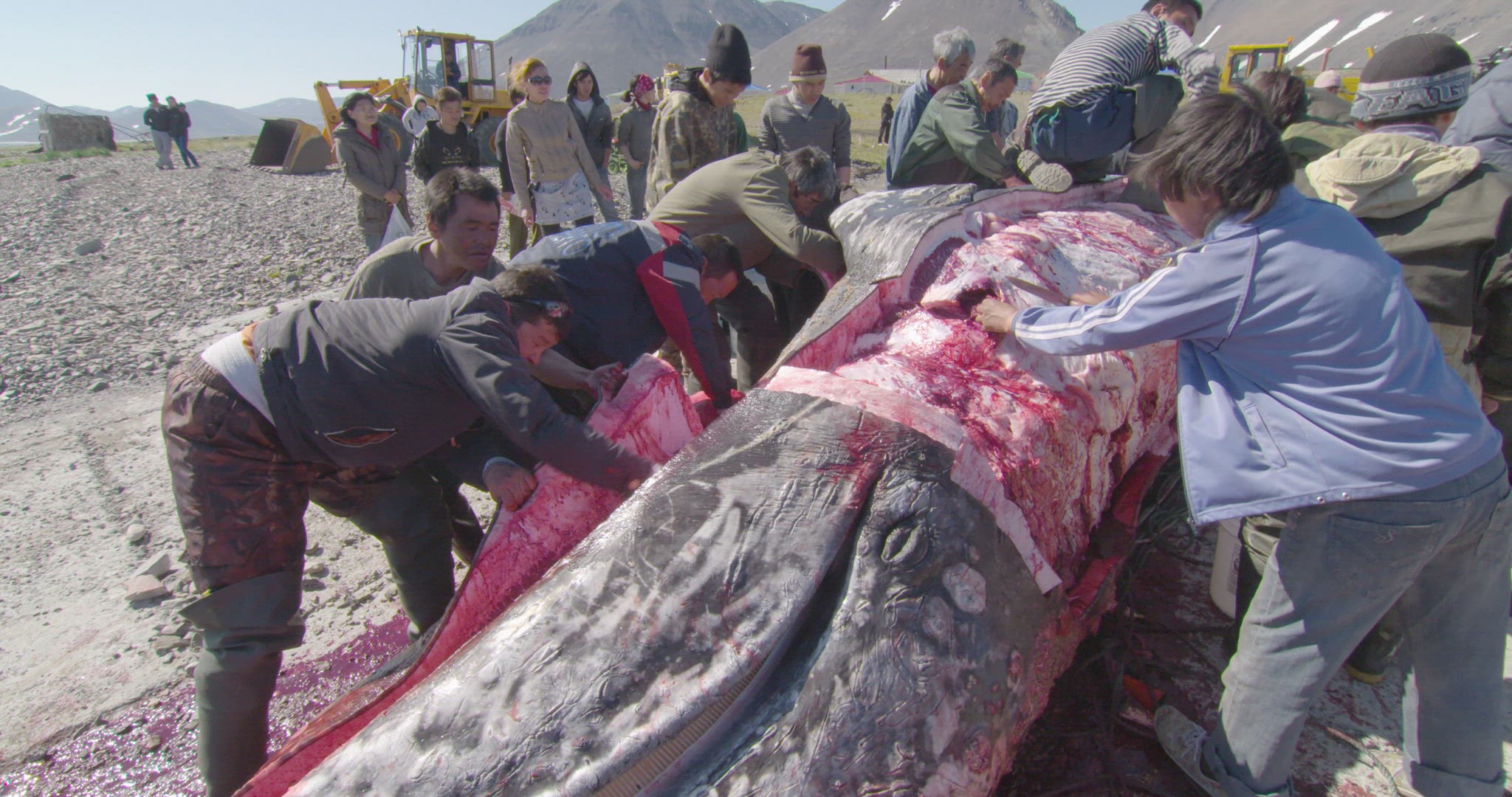 pulling whale carcass out of ocean by truck and rope
