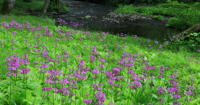focus pull of flowers growing on a hill with a valley and river below
