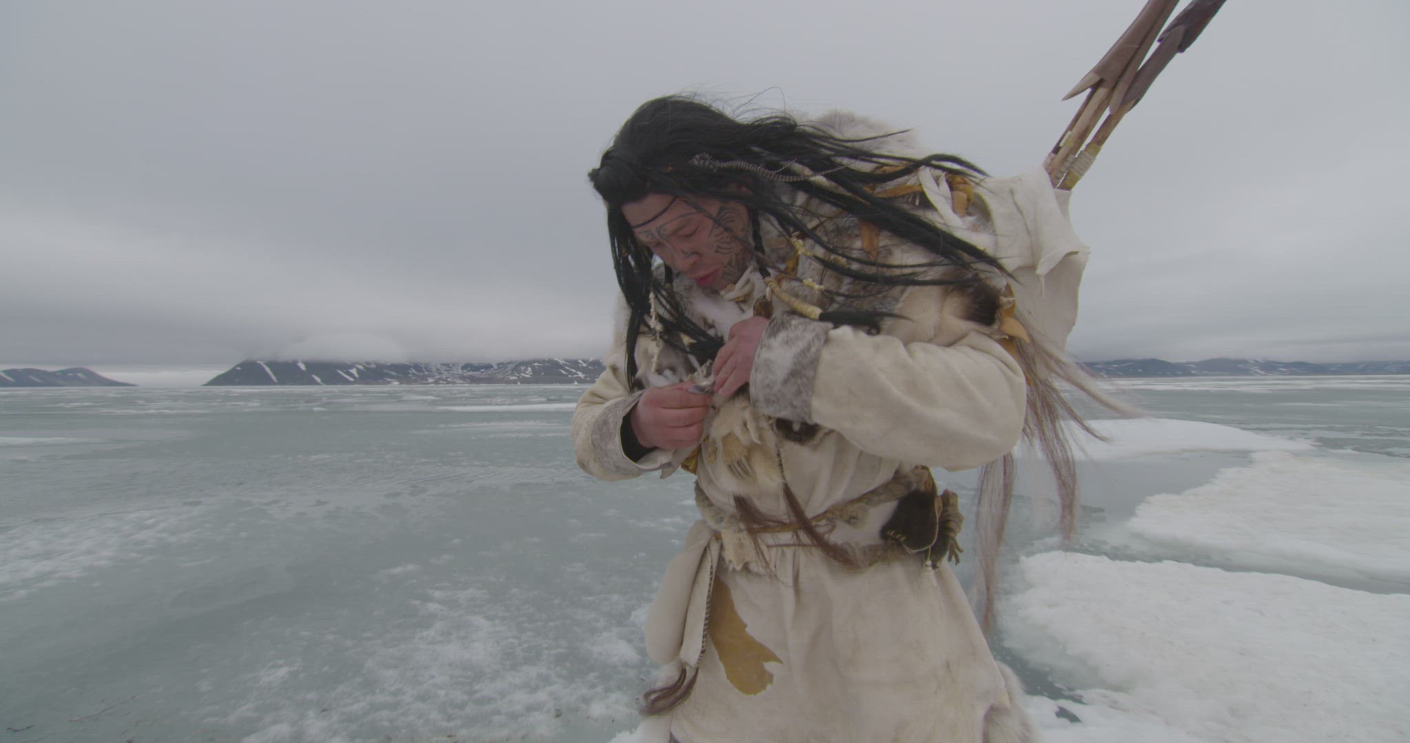 nomadic hunter outside traditional animal fur hut in high arctic foraging food
