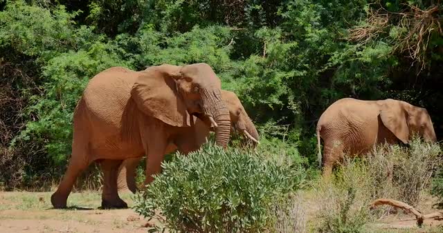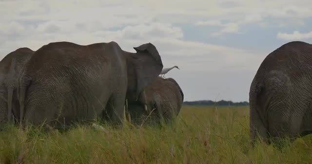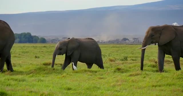 > herd of elephants walking across grasslands in front of lion pride