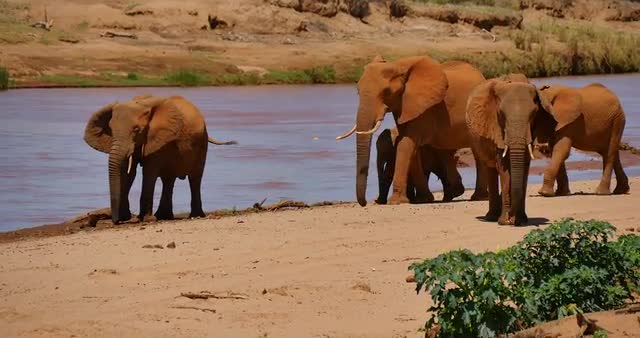 herd of elephants walking across grasslands in front of lion pride