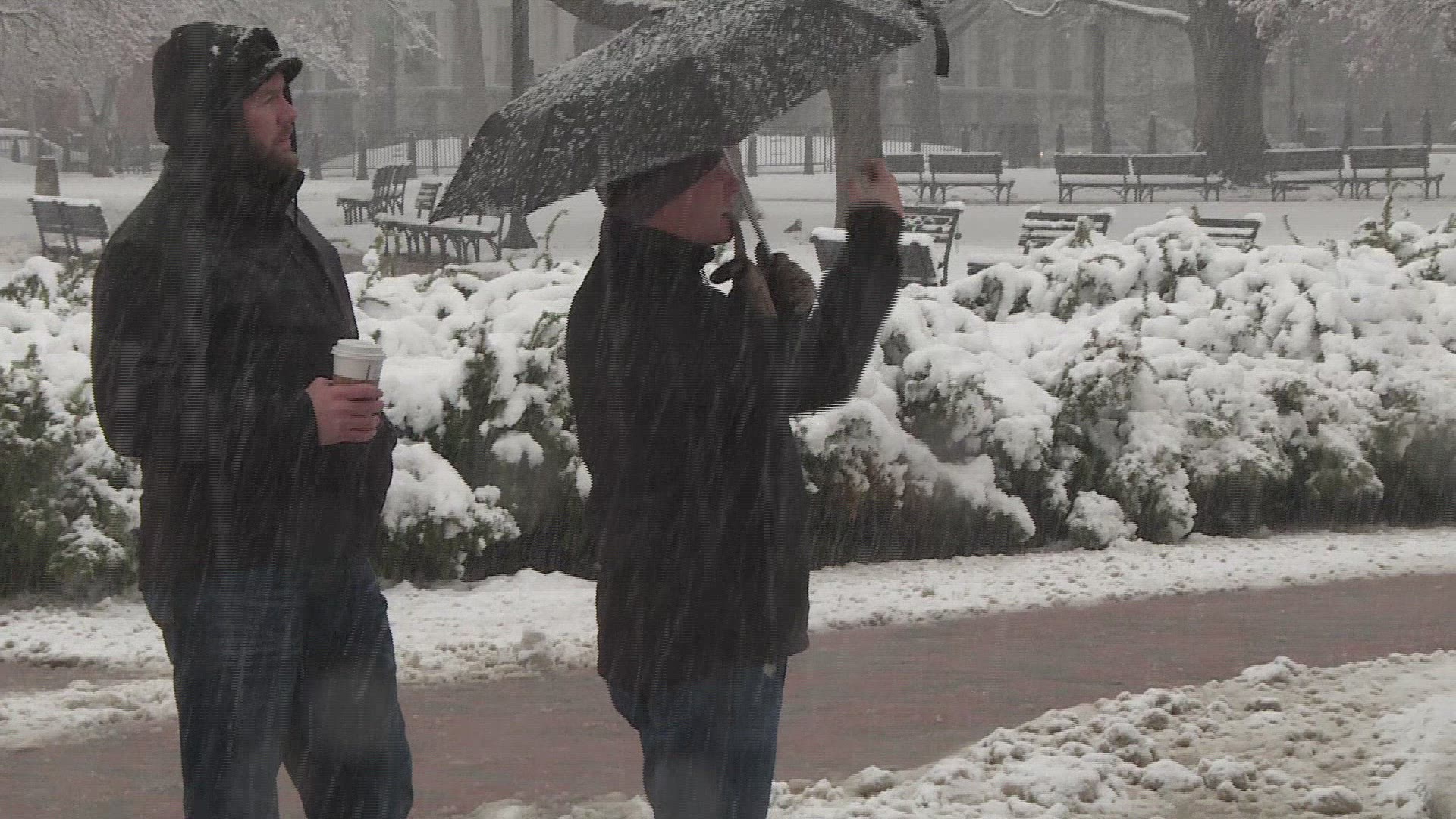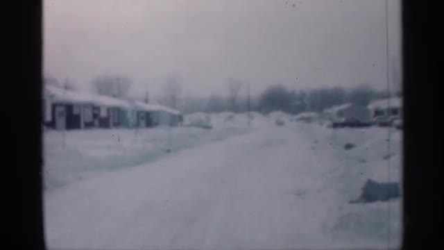 Driving down storm snow covered road at night with semi truck spraying mist over headlights