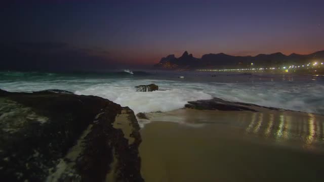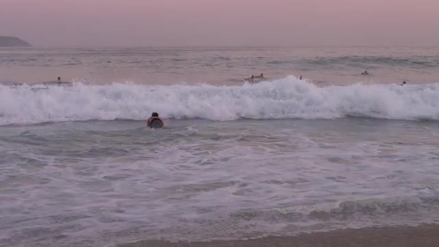 > Slow motion tracking follows surfer catching wave and riding down face at base of snowy mountain