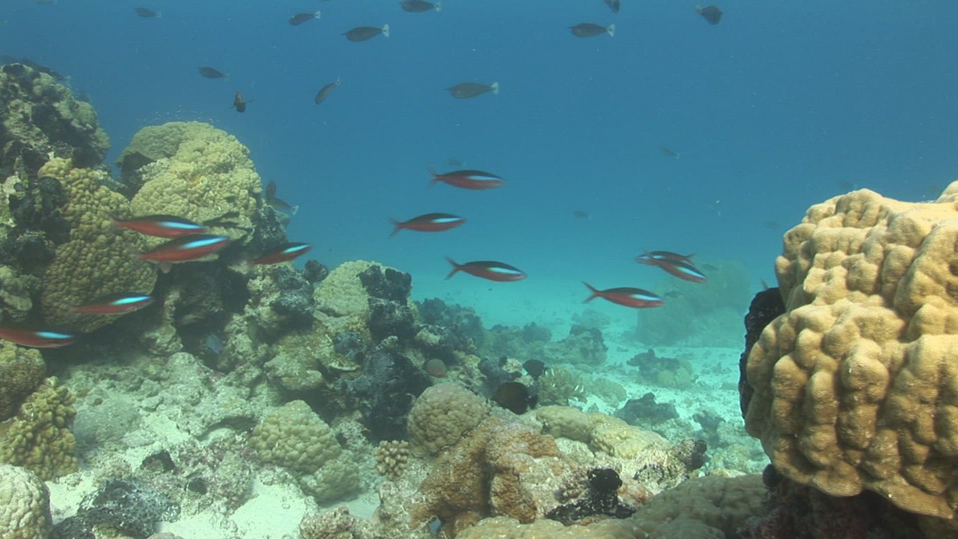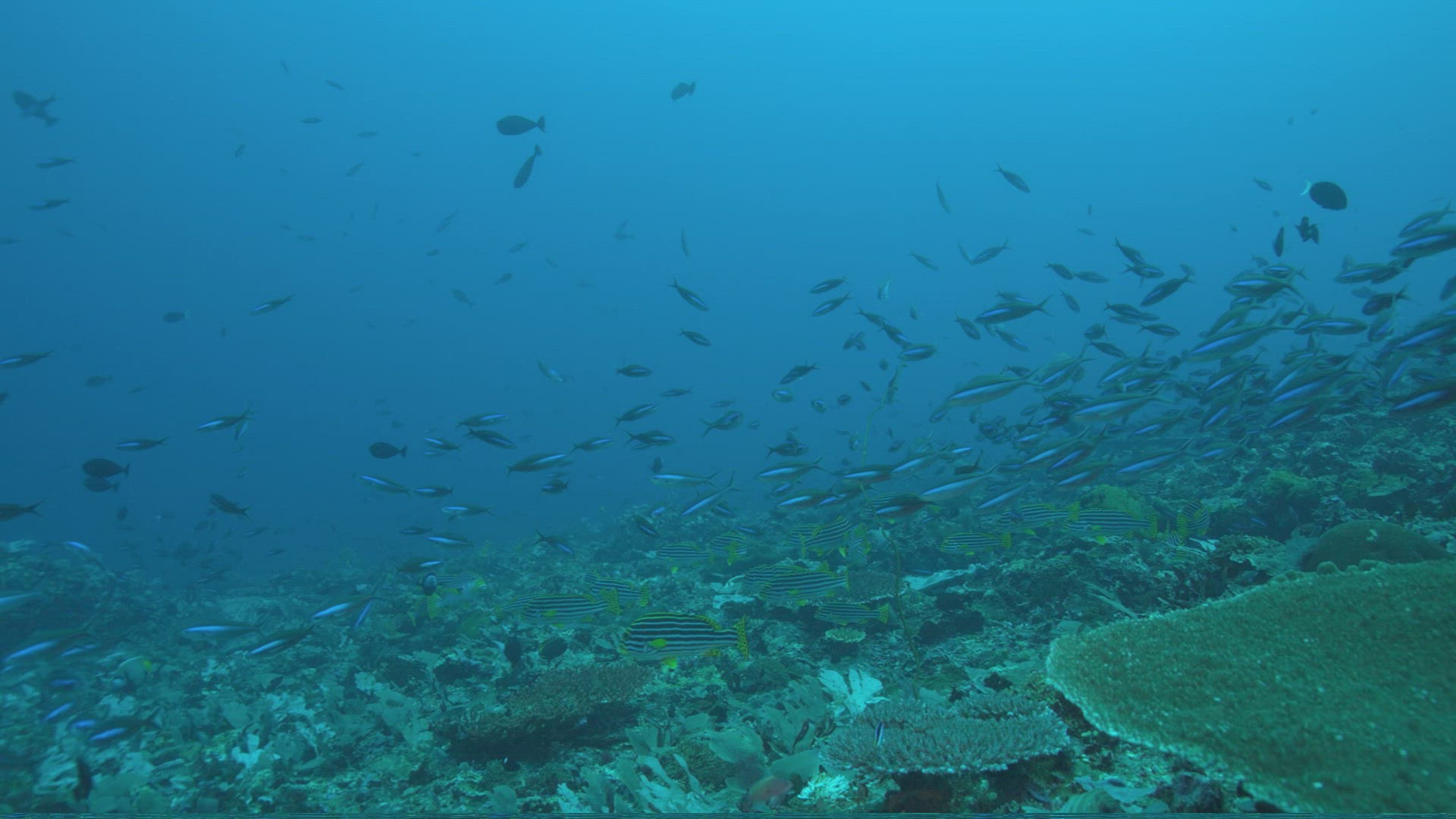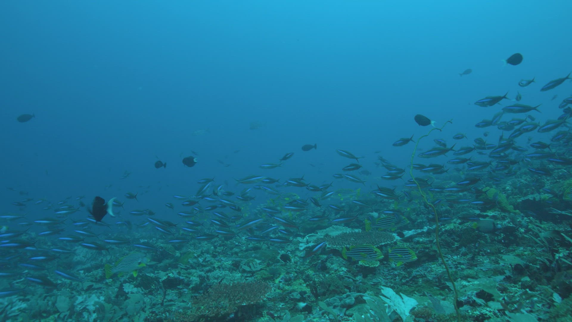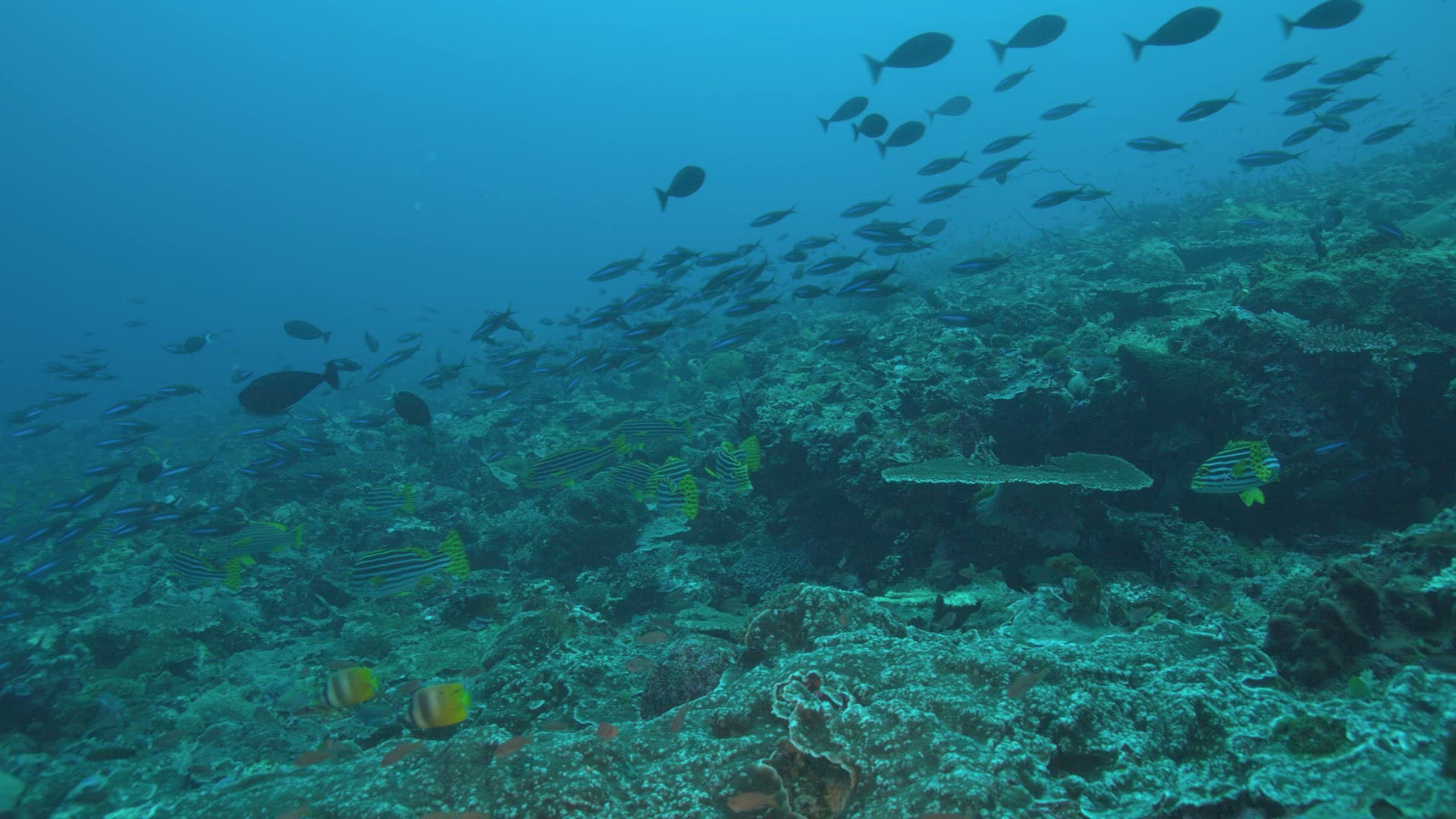School of dark tropical fish swim in slow motion in turquoise blue water above reef