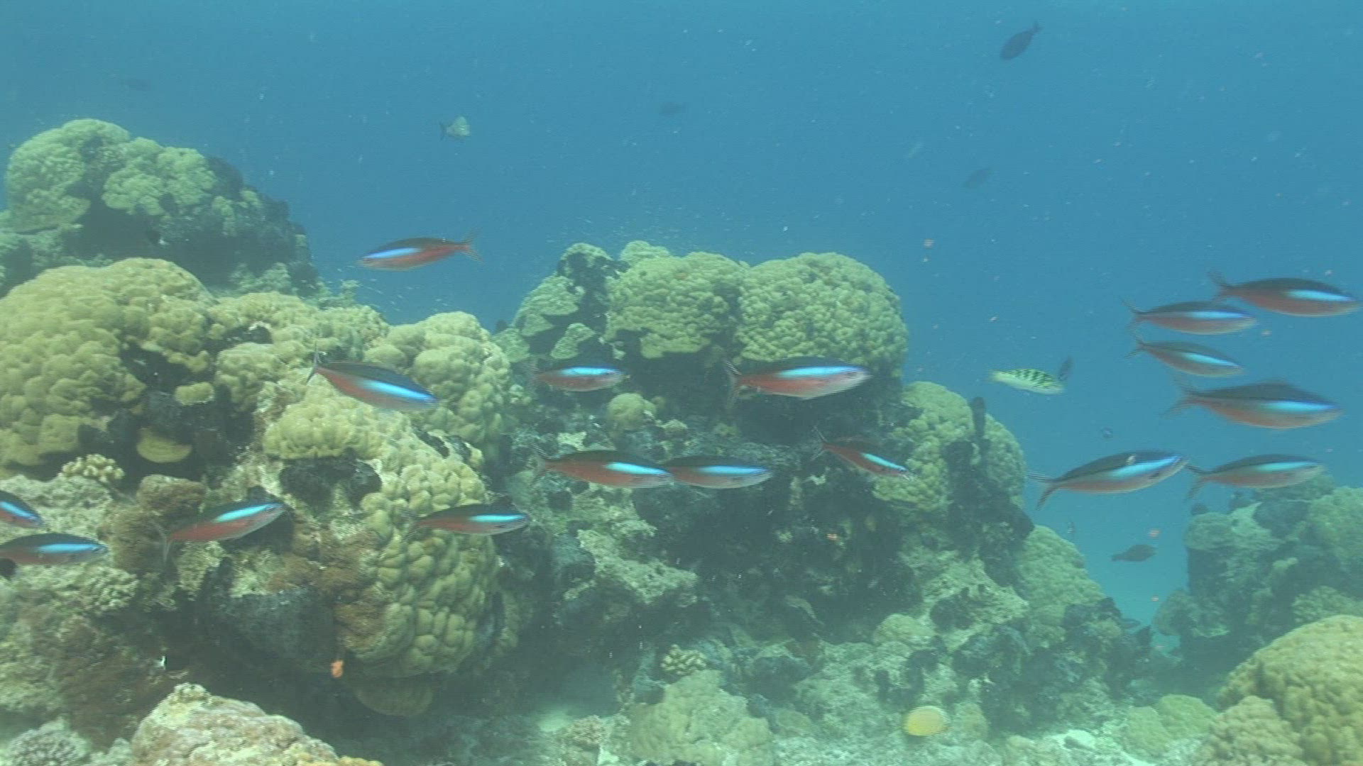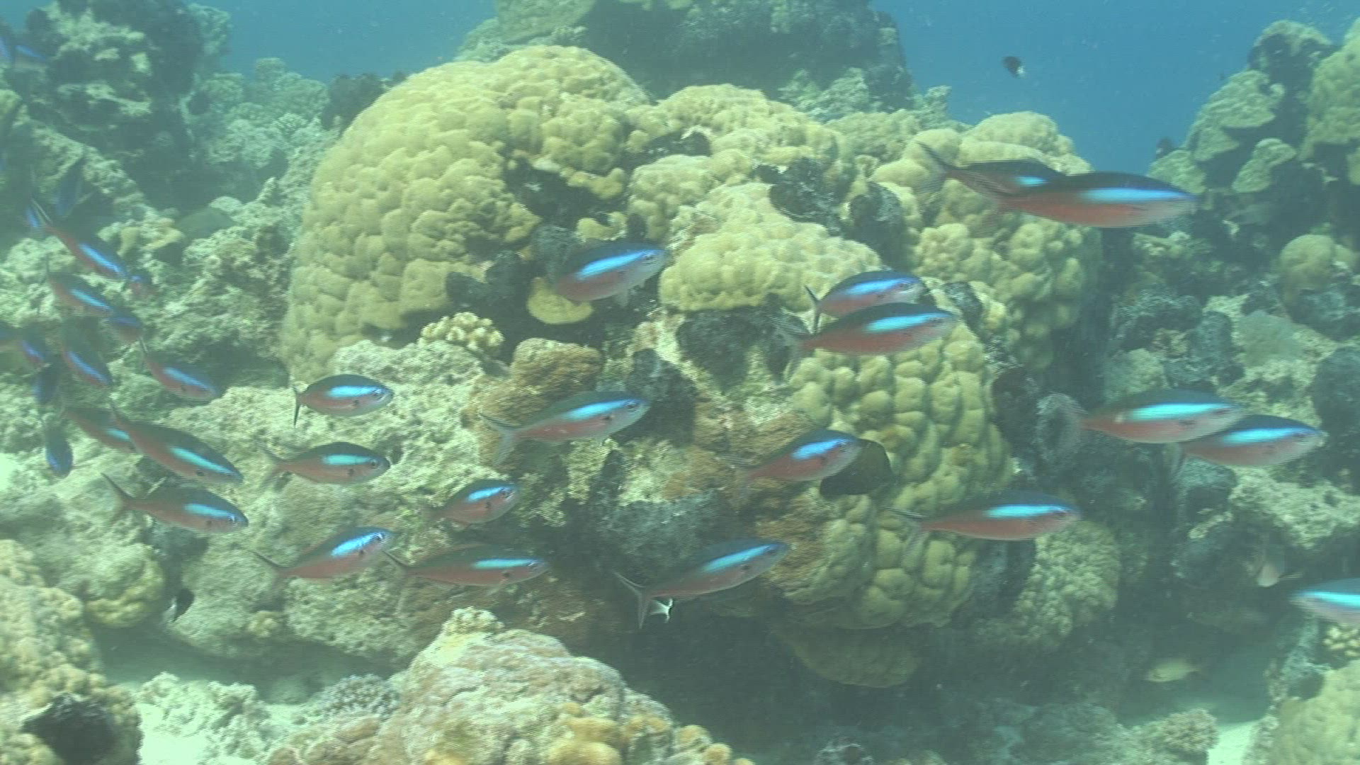 > School of dark tropical fish swim in slow motion in turquoise blue water above reef
