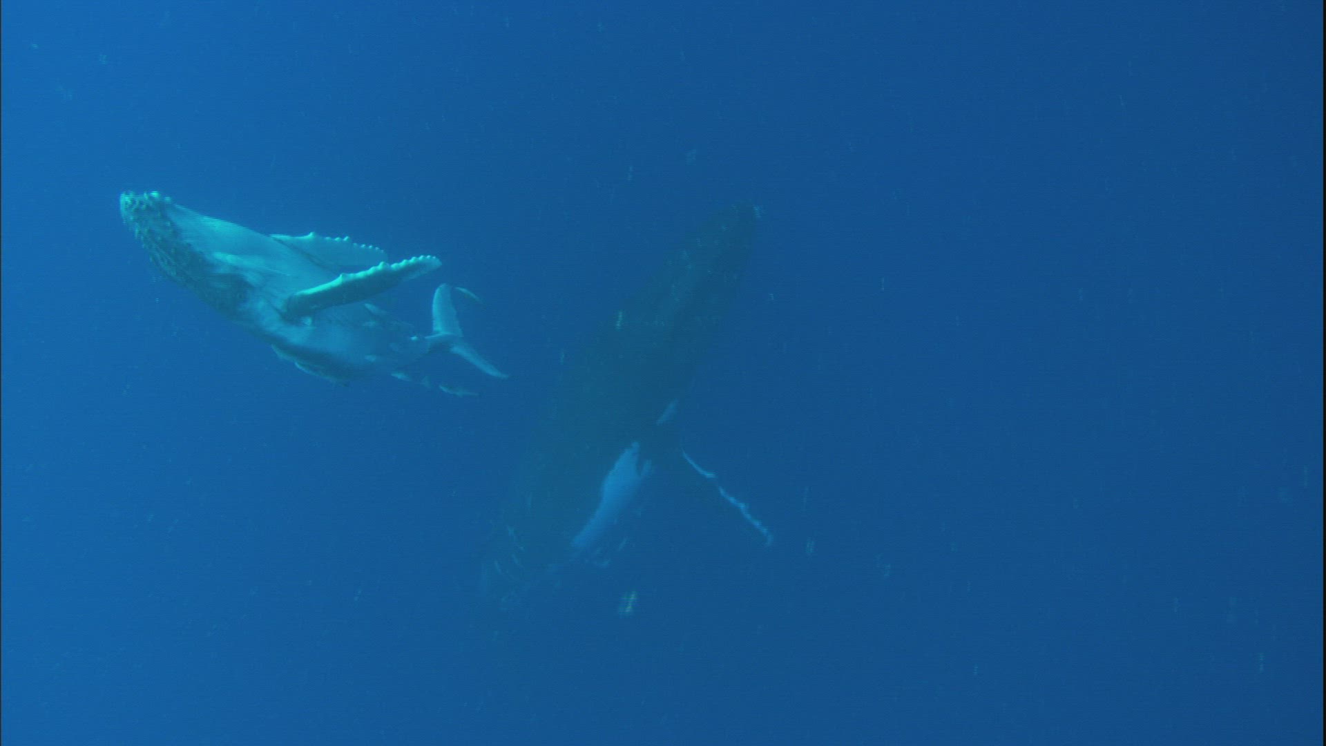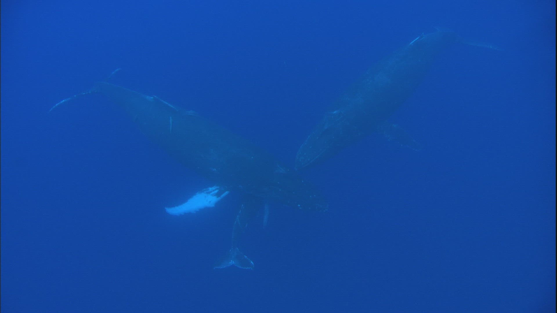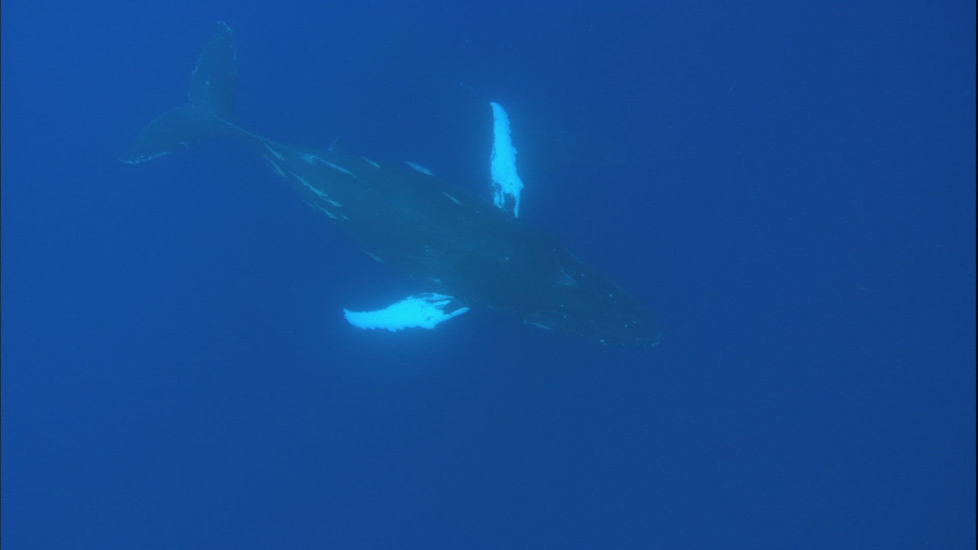 > Vertical high view of whale shark swimming across open ocean waters with light beams trickling down