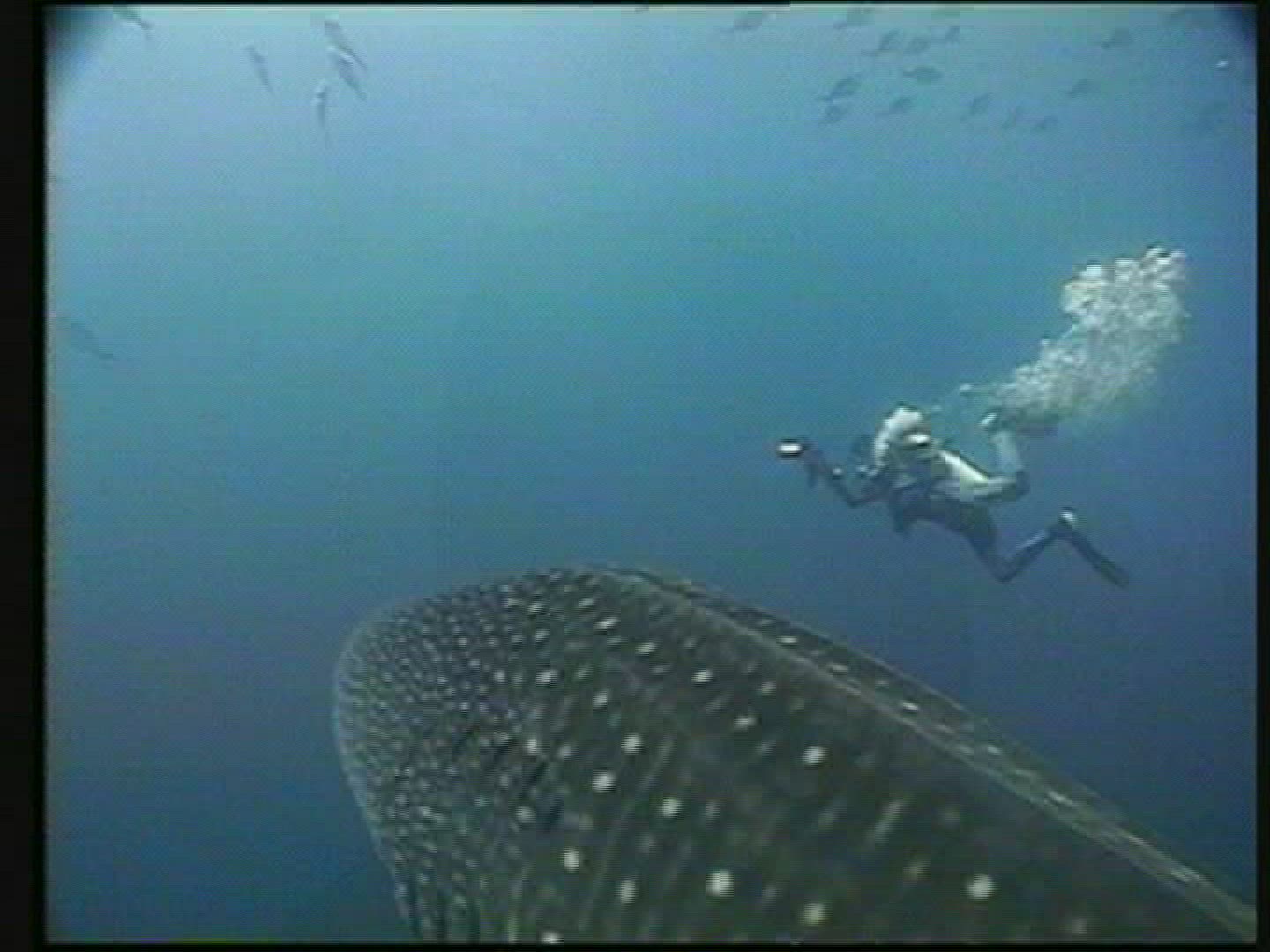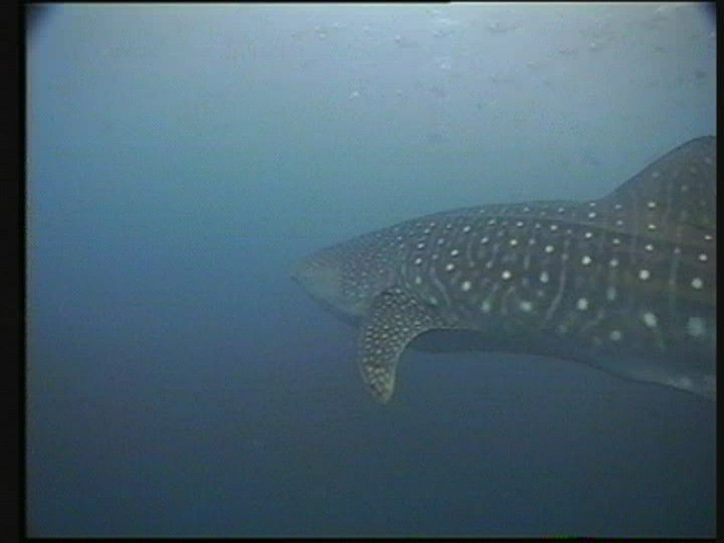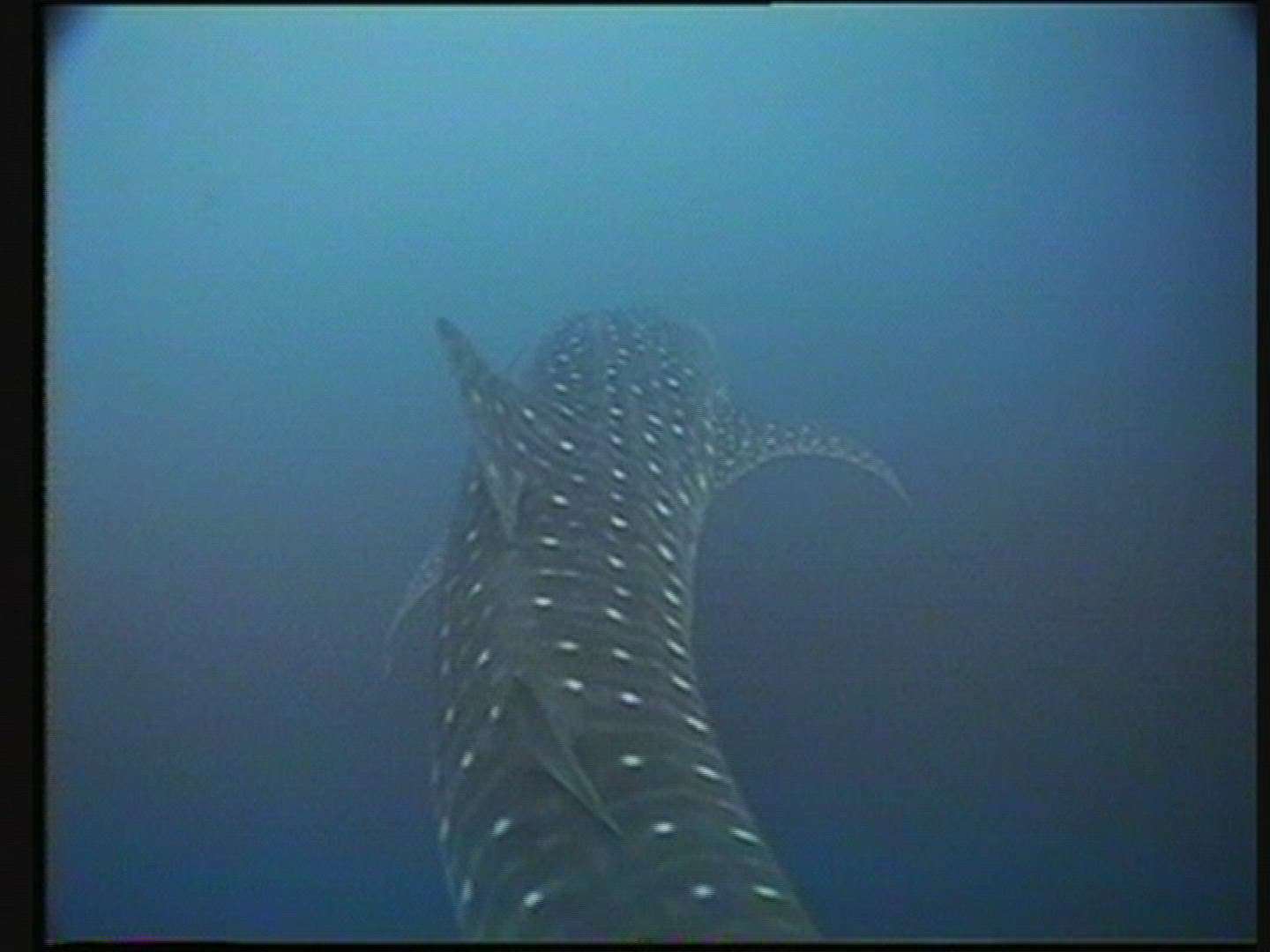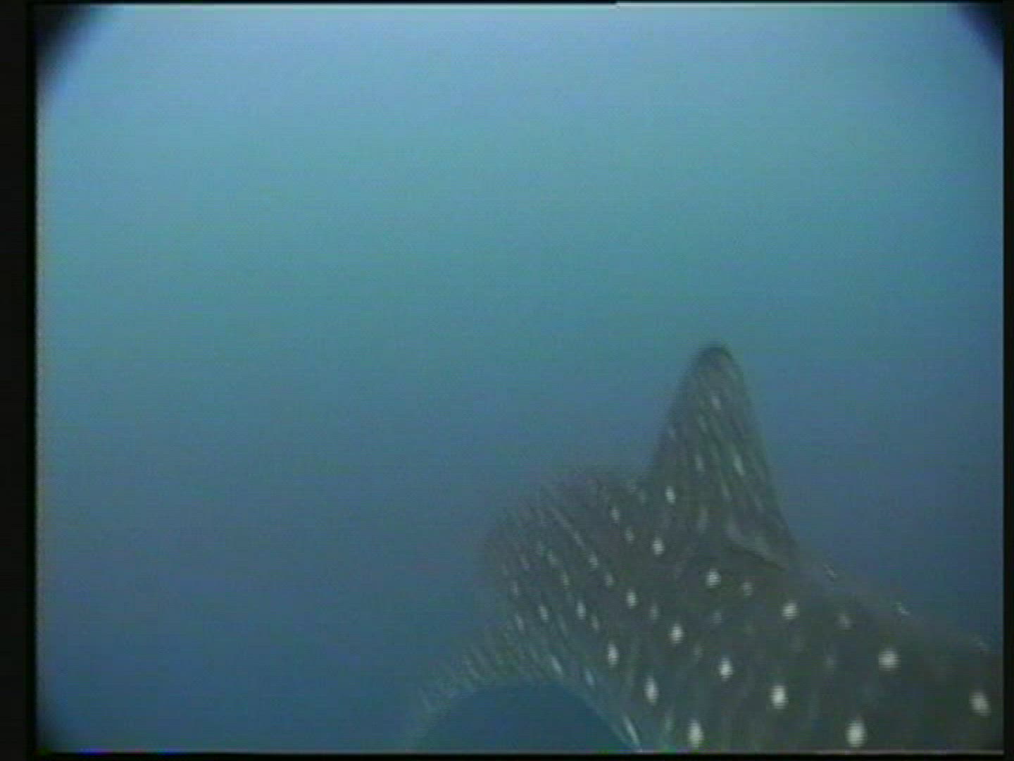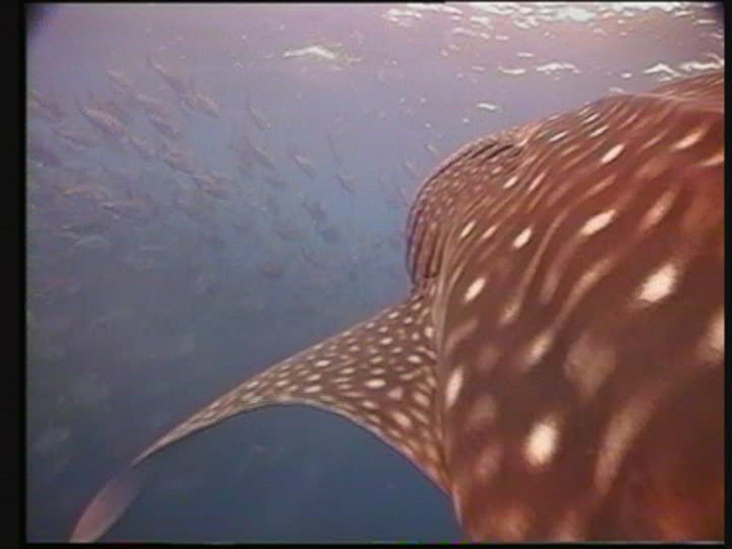 > Whale shark near ocean water surface reflection shimmers grey as tail cuts across water