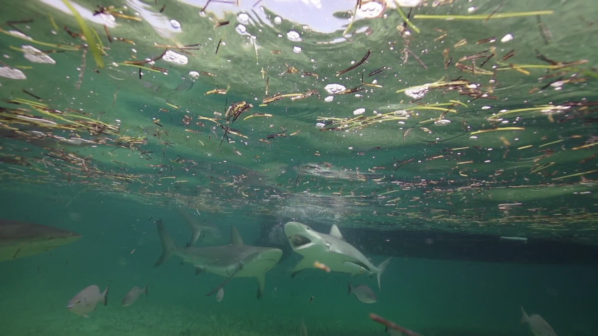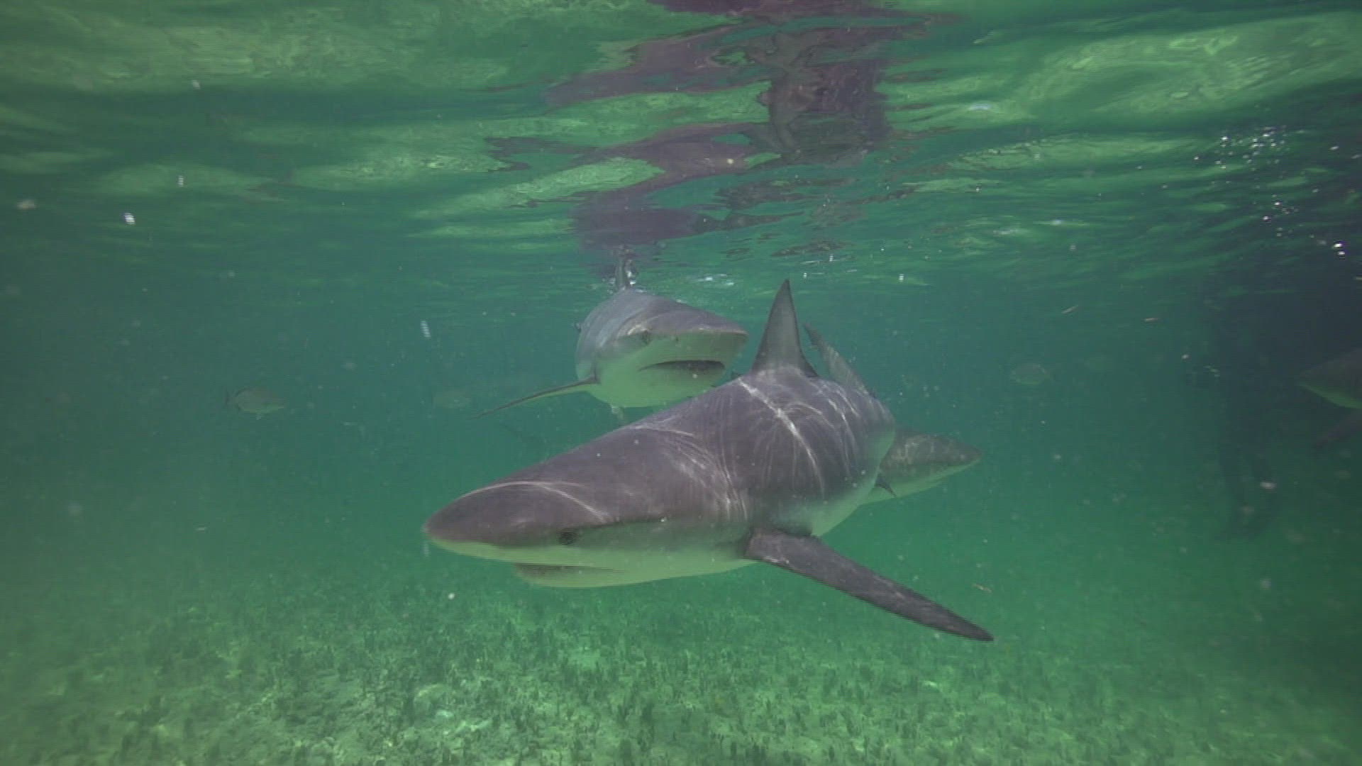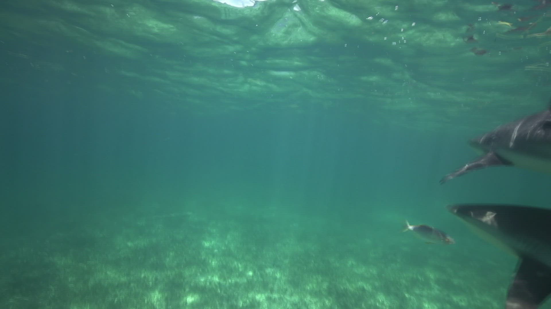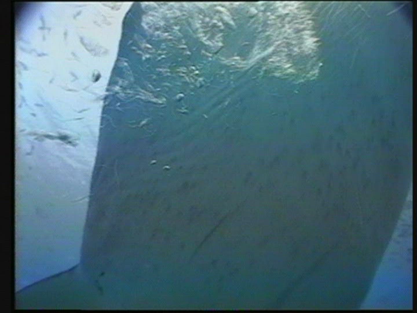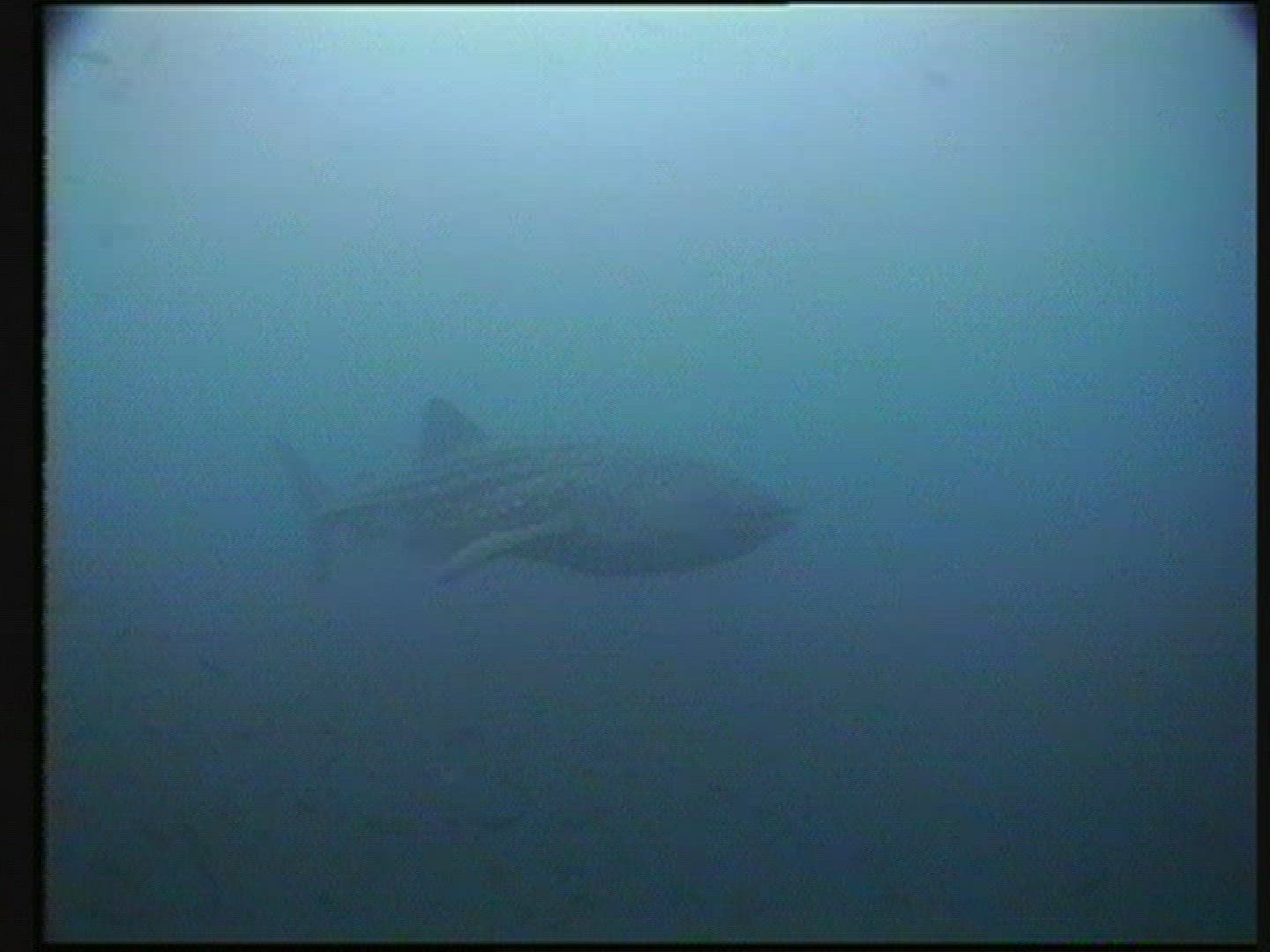 > Whale shark near ocean water surface reflection shimmers grey as tail cuts across water