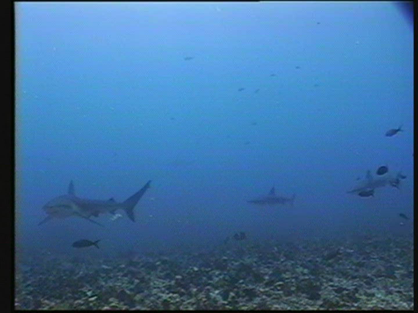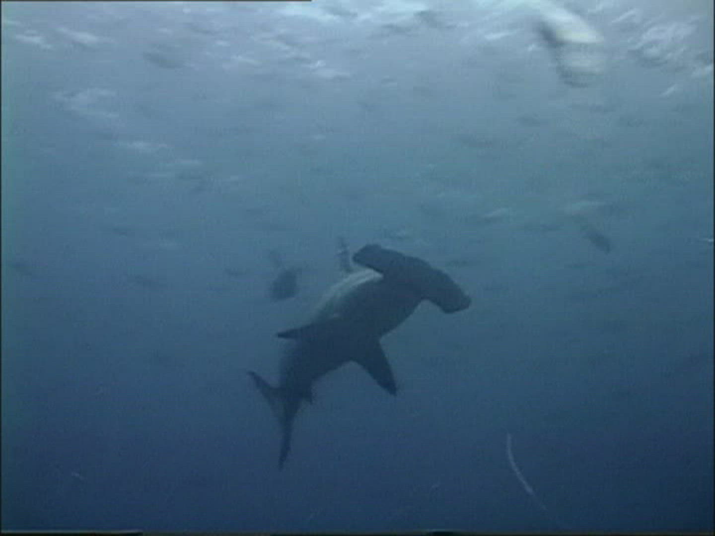 > Full sideview of whale shark at surface of open ocean with school of fish, slow motion
