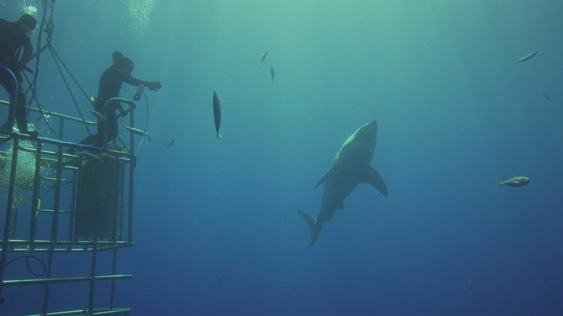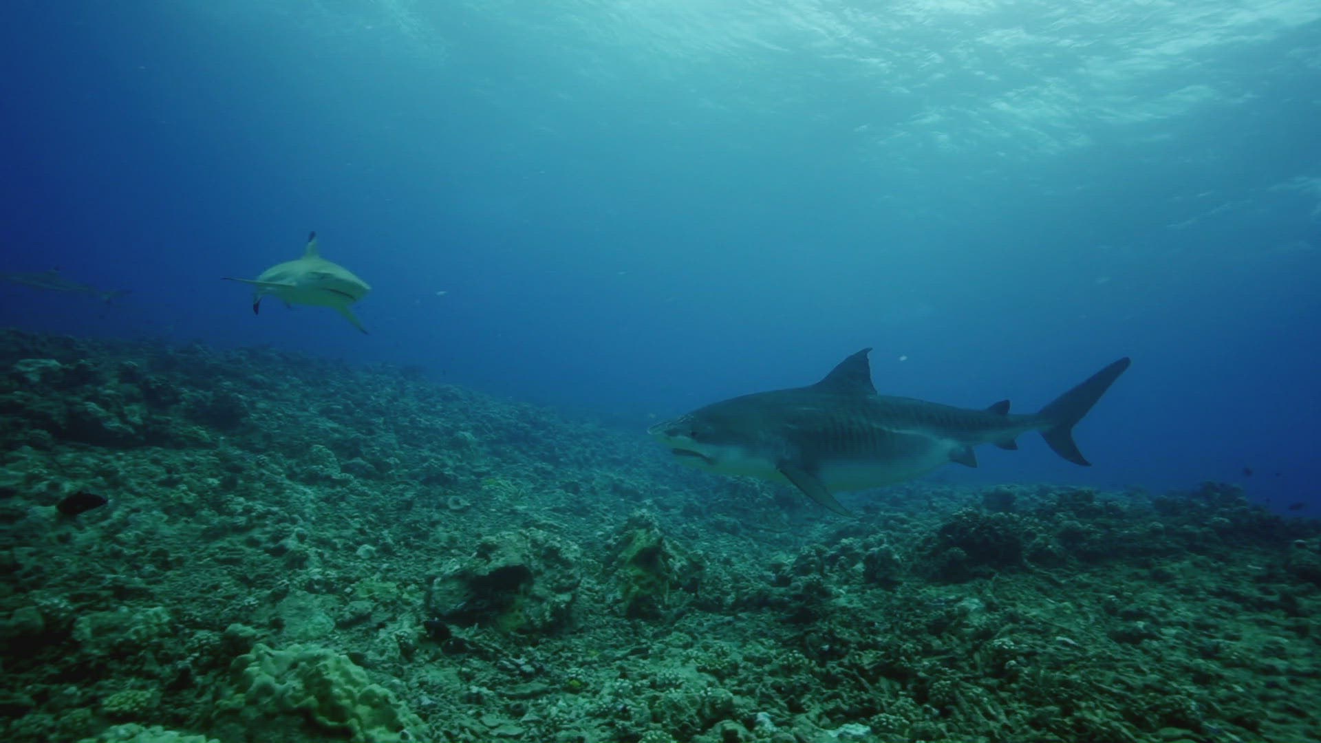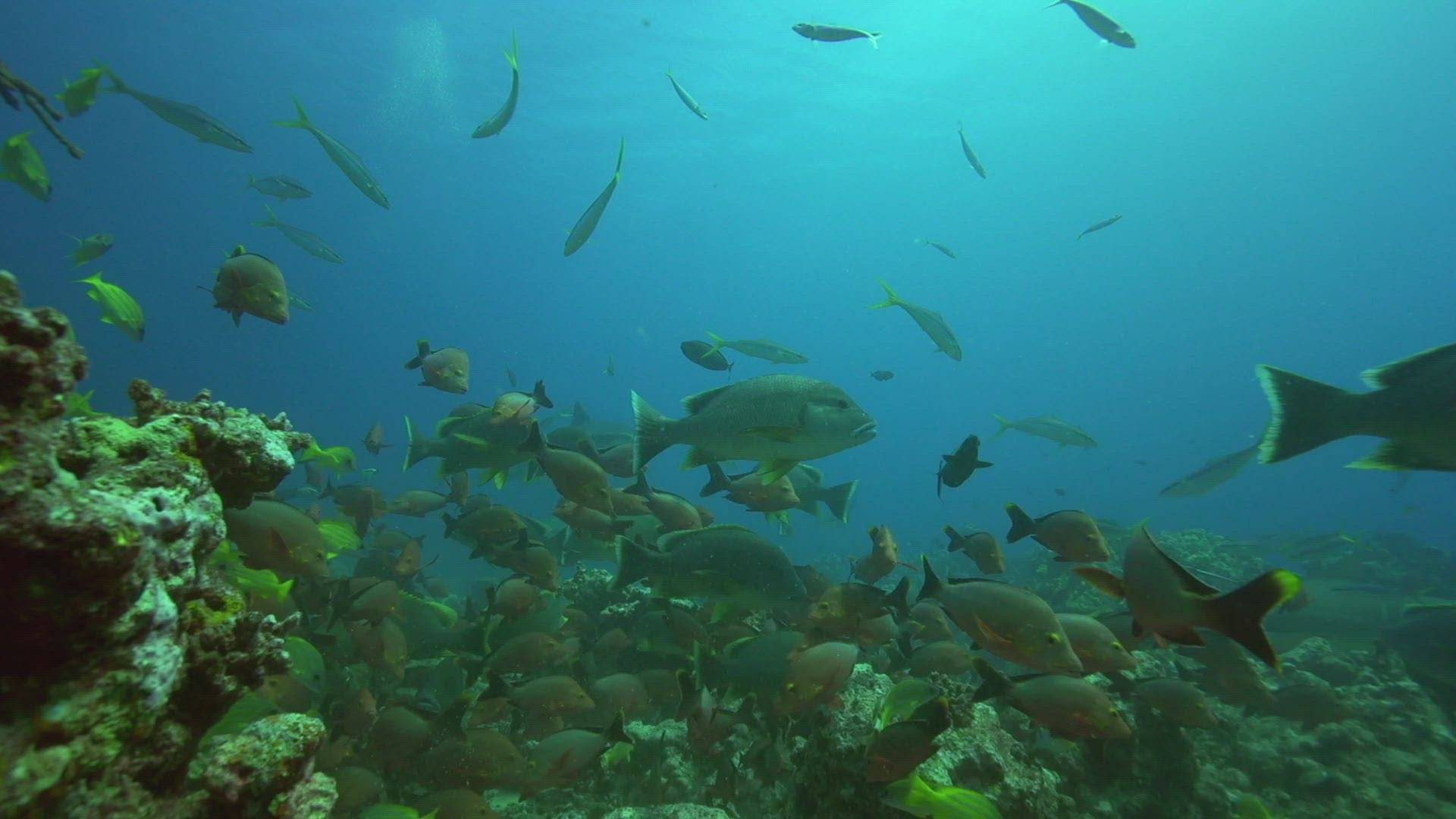 Pan across divers with underwater camera as they follow beautiful ocean creatures