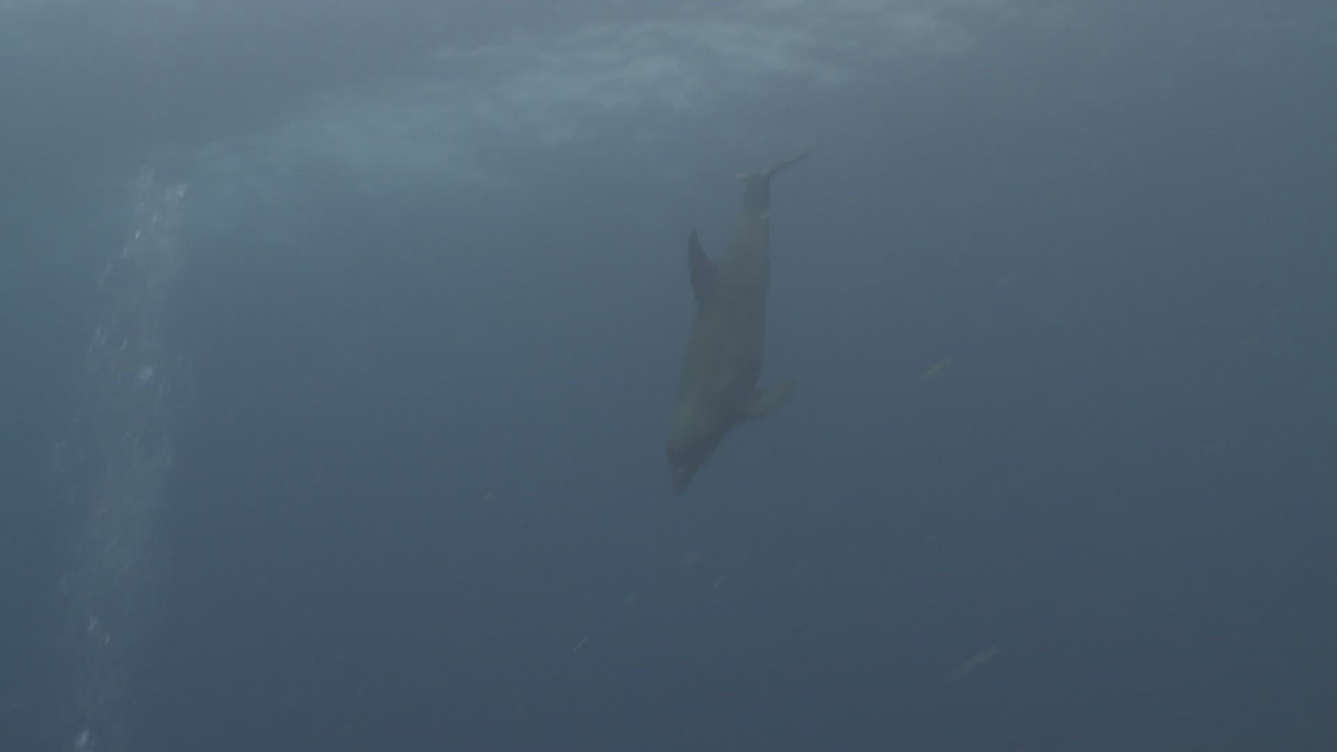 > Pan across divers with underwater camera as they follow beautiful ocean creatures