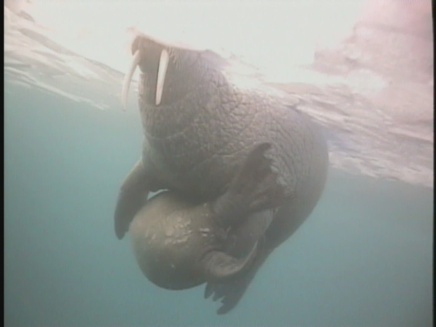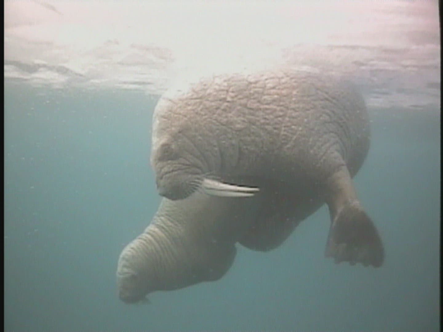 > Underwater photographer swims at surface holding camera down as they kick in fins