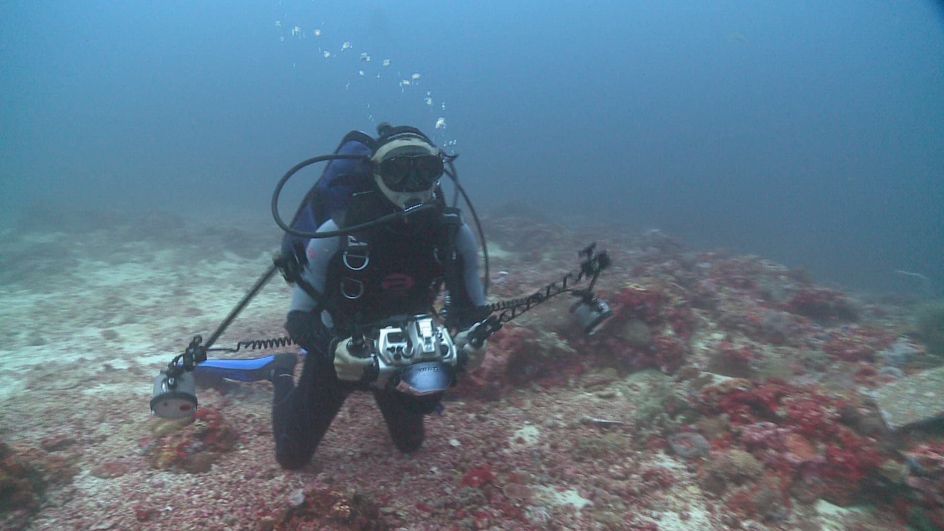 2489394 - Scuba diver holding a camera inside a shark cage, slow motion at Neptune Islands