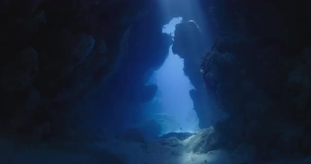 > Light rays fall across sandy bottom dancing across water column for mystical nature background