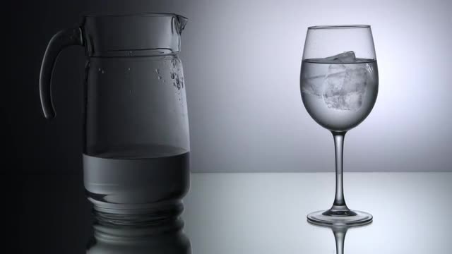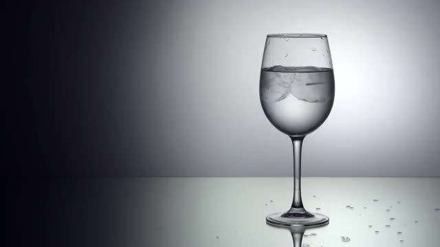 1100599 - Macro ice cube in empty glass as clear soda pours in and tiny bubbles fizz