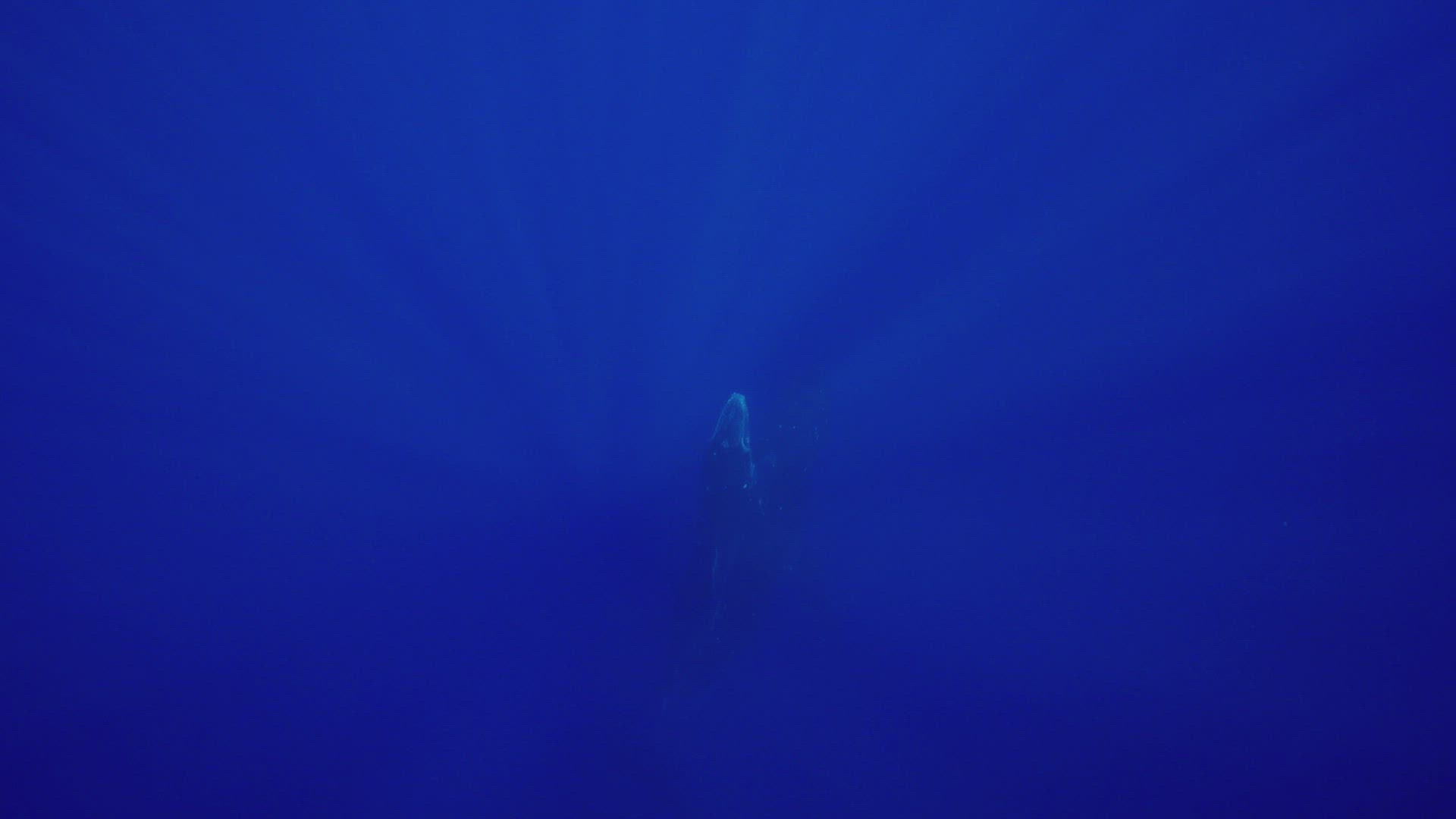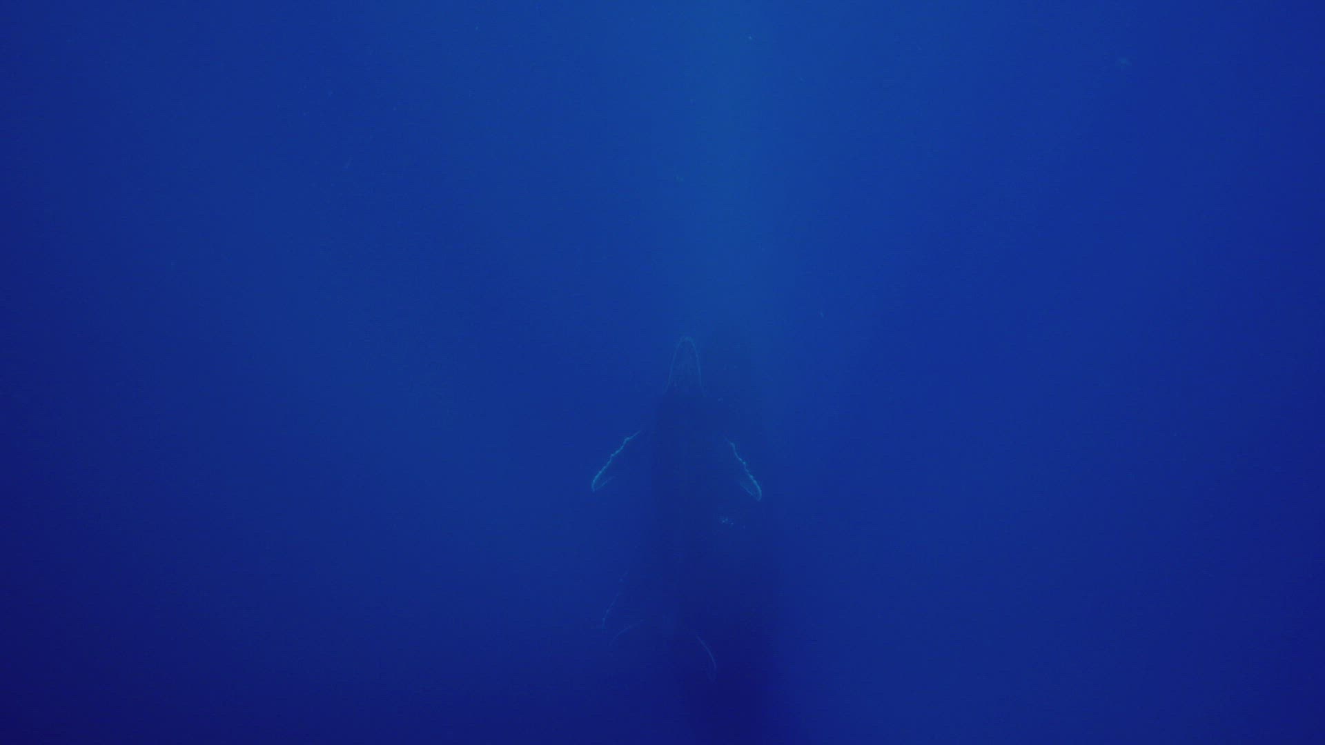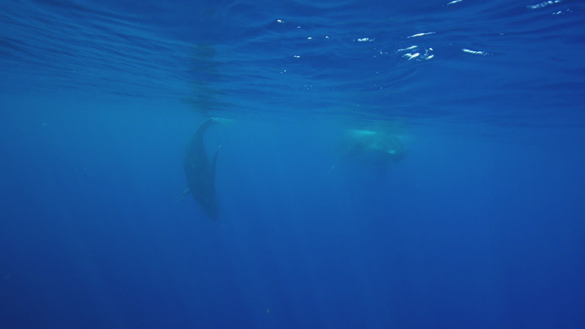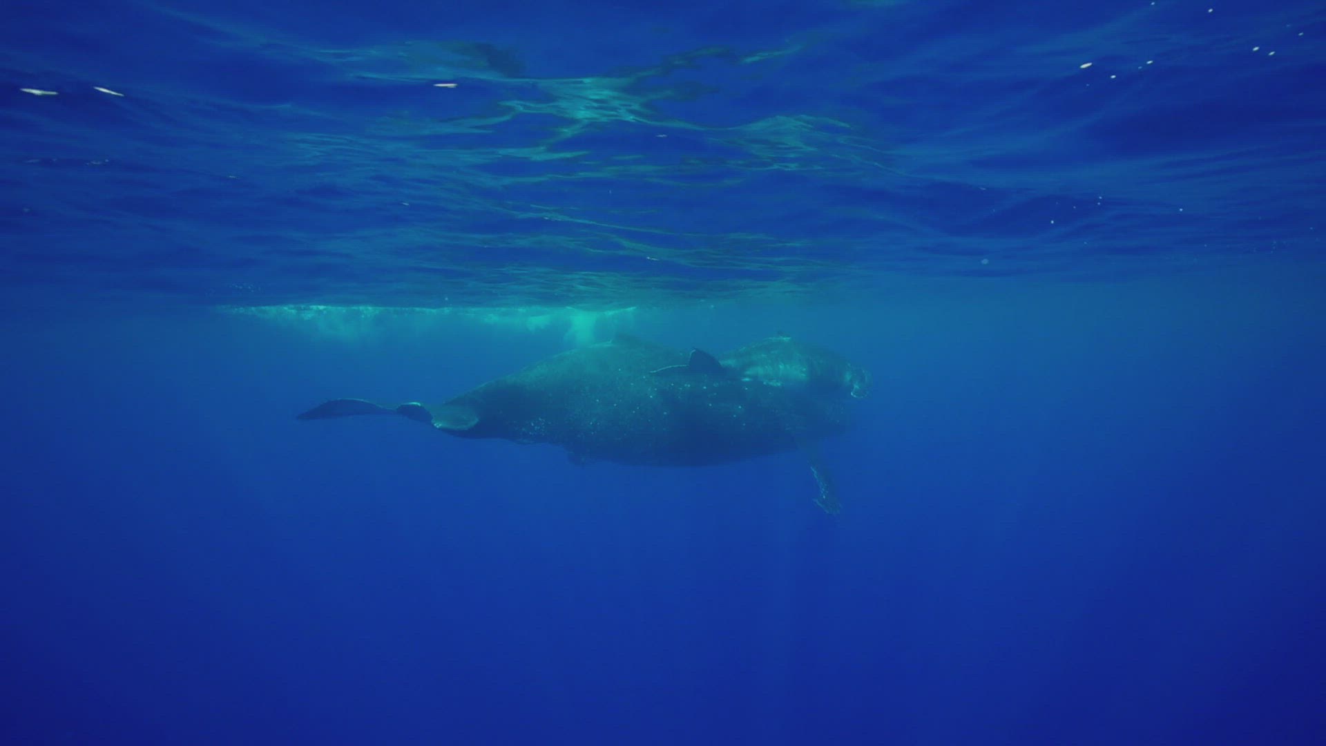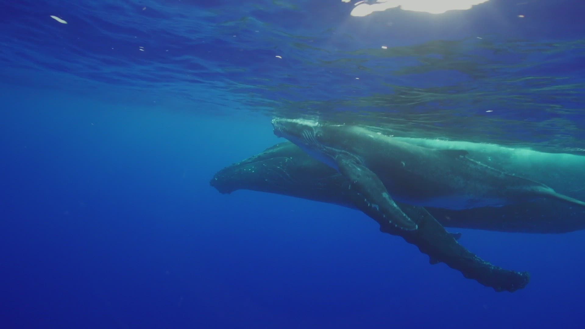 > Amazing Whale Encounters In The Kingdom Of Tonga; Curious Baby Whale Calf Emerges From The Deep Sea Approaching A Pair Of Snorkelers Floating On The Surface Of The Water; 4K Low Angle Underwater POV.