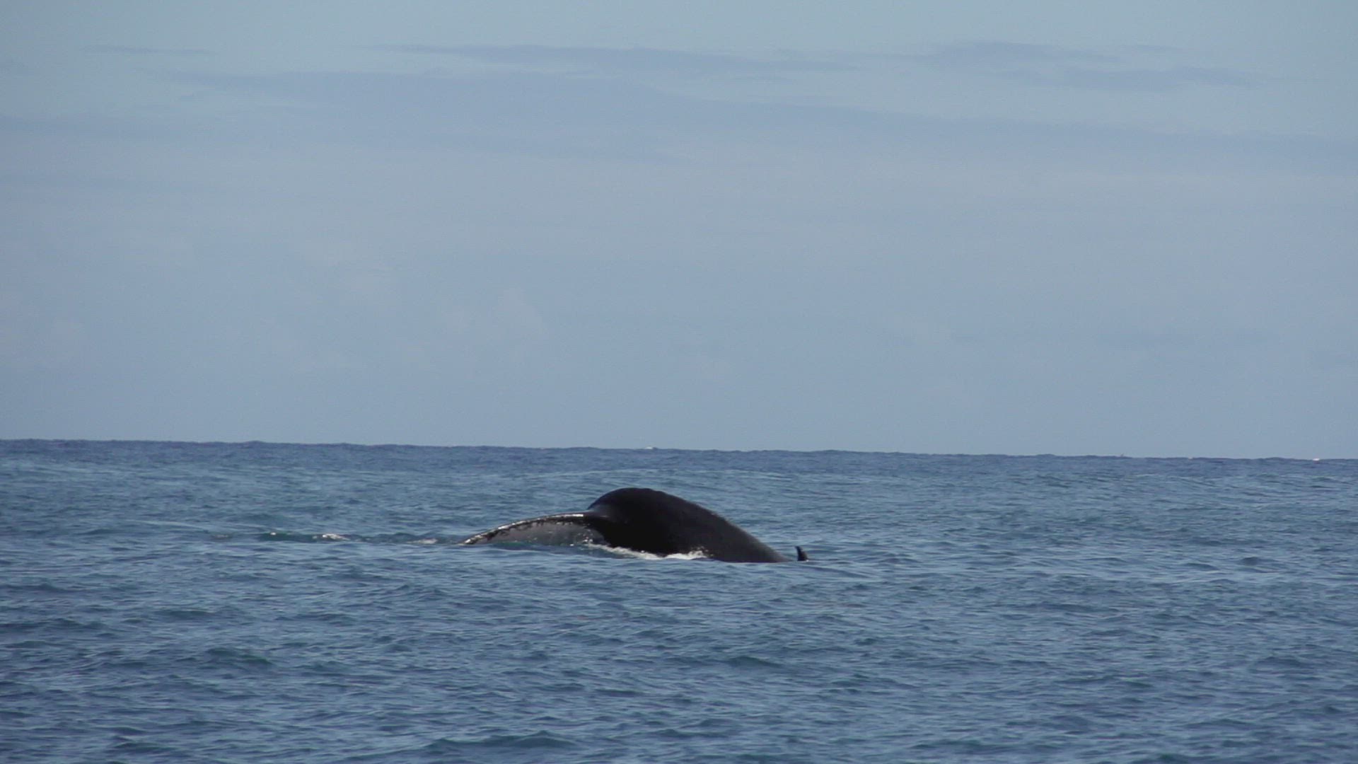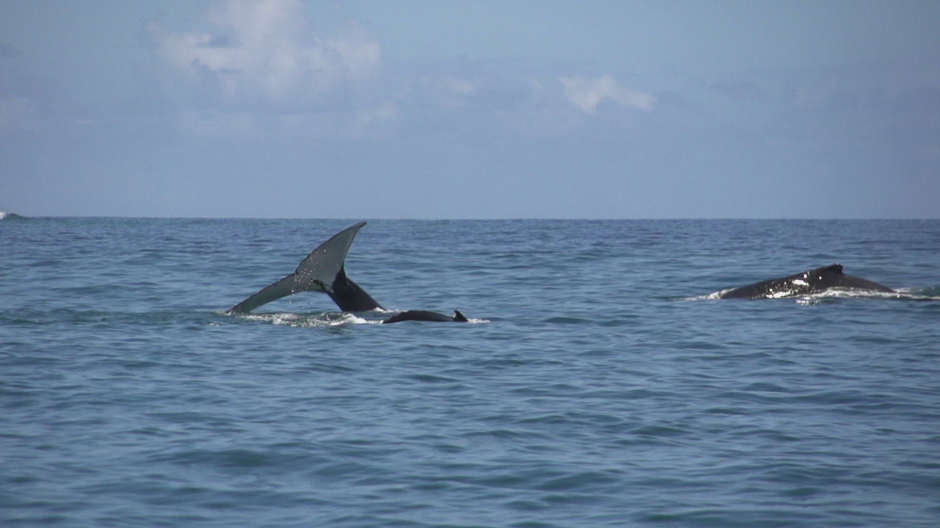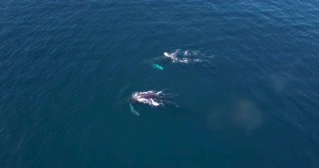 > Seagull soars in sky above ocean as humpback whale breaches and splashes into golden water