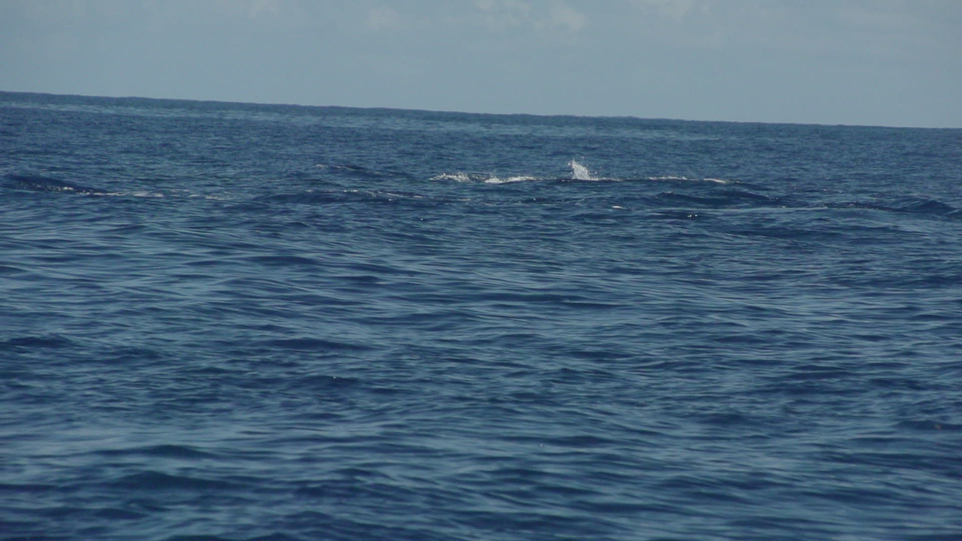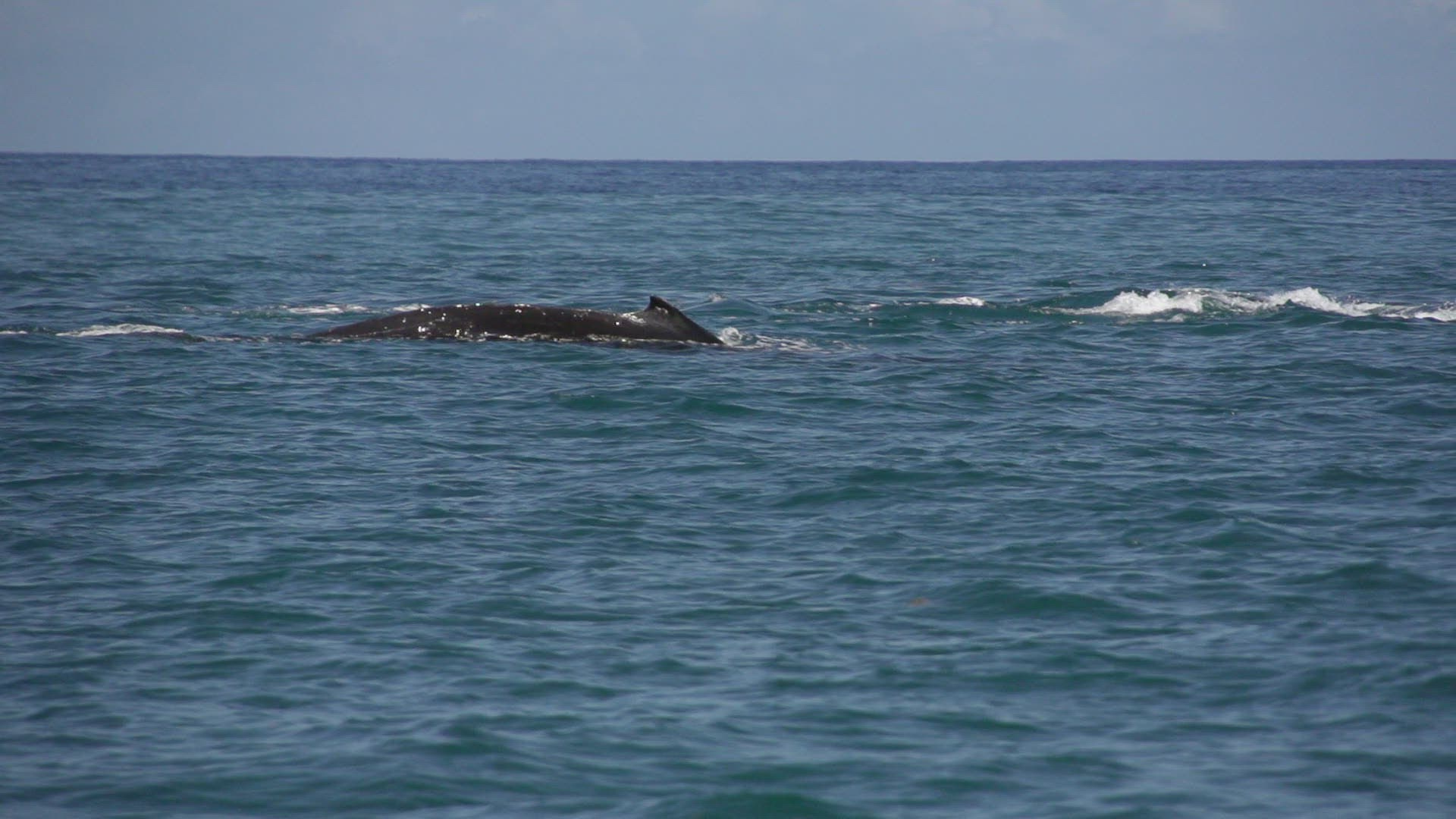 Seagull soars in sky above ocean as humpback whale breaches and splashes into golden water