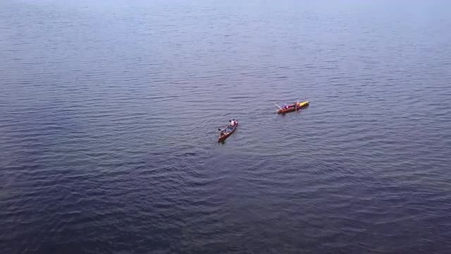 Drone top down follows humpback whale family pod breaching and spout into air as they swim through clear deep water