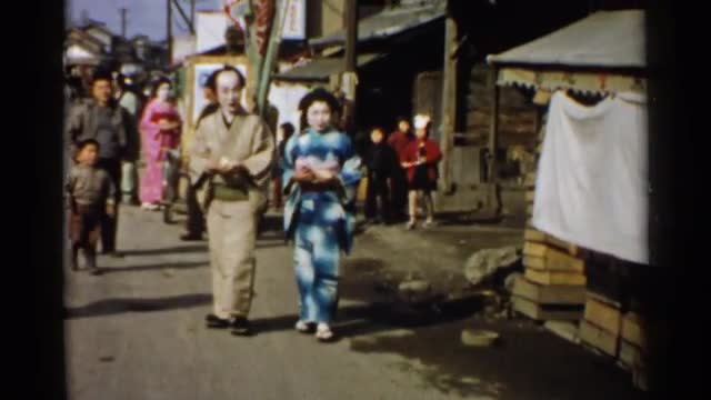 Geishas: Hairdressers' Convention - women learn to do their hair like geishas. Geishas on stage; geishas do crane dance with fans; geishas dance with men; geishas walk through garden full of cherry trees; geishas bow in garden; geishas arrange flowers and drink tee; geishas look at sign in English; geishas drink tea outside in garden; geishas talk to American sailors; geishas drink tea with sailors; geishas next to koi pond; geisha opens screen in house; geisha plays musical instrument; another geisha does dance with parasol; geishas dance on stage; geisha takes off kimono; performers dressed as geishas on stage; modern geishas on streets of Japan; geisha talks on cellphone.