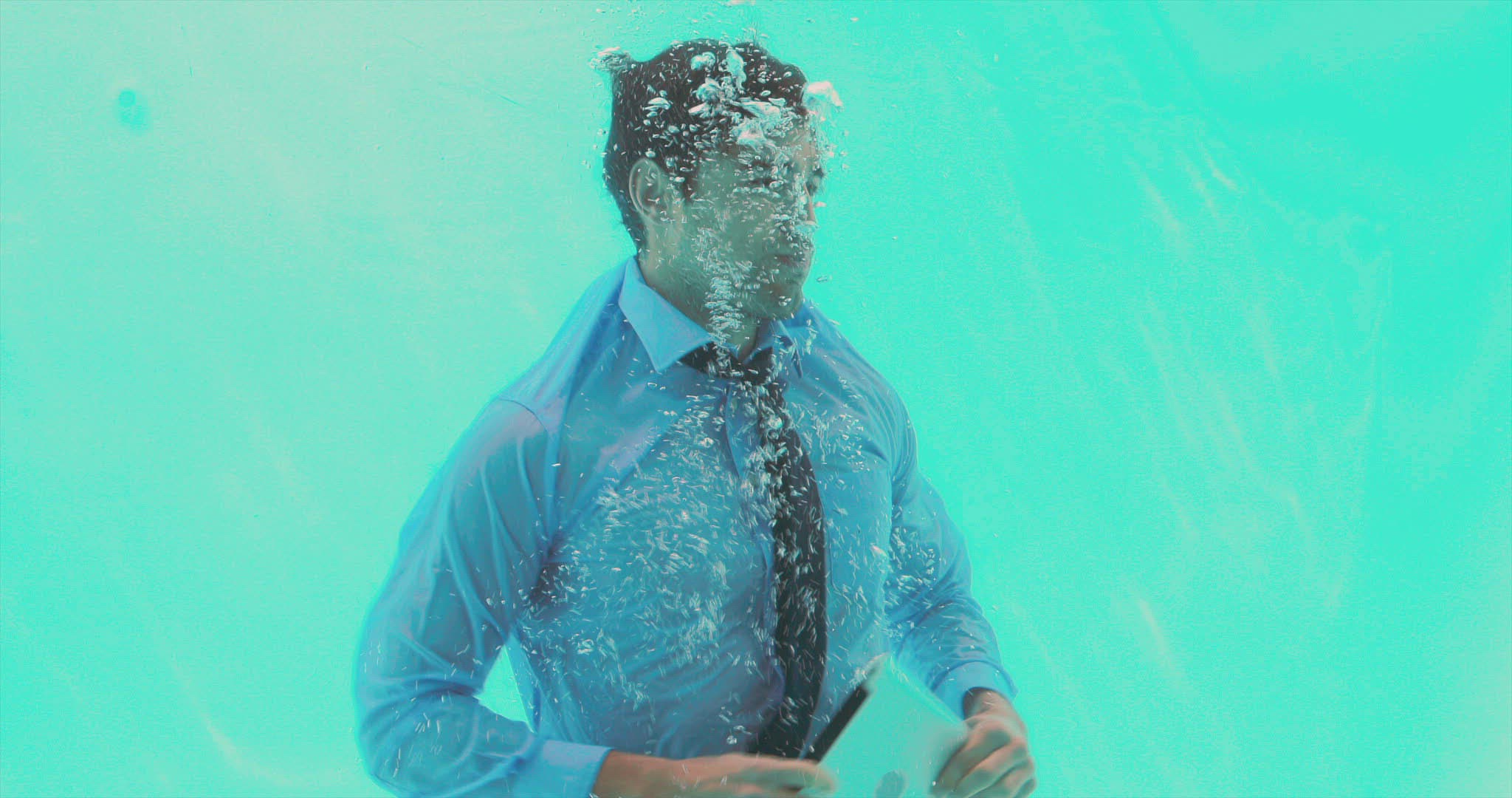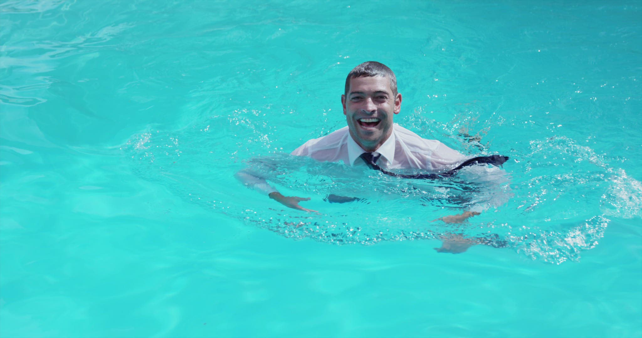 A young Surinamese man wearing sunglasses is lying on his back in the sun in a blue swimming pool, sending and receiving messages on his smartphone. His head and shoulders are visible.