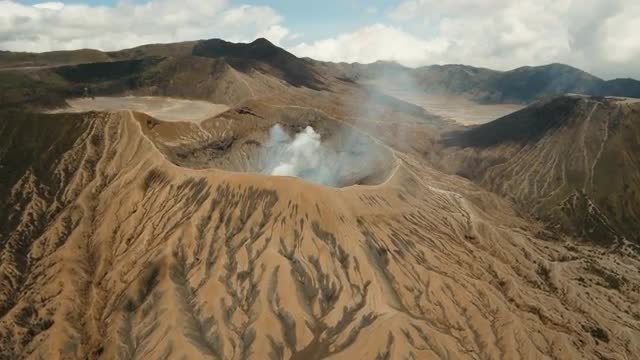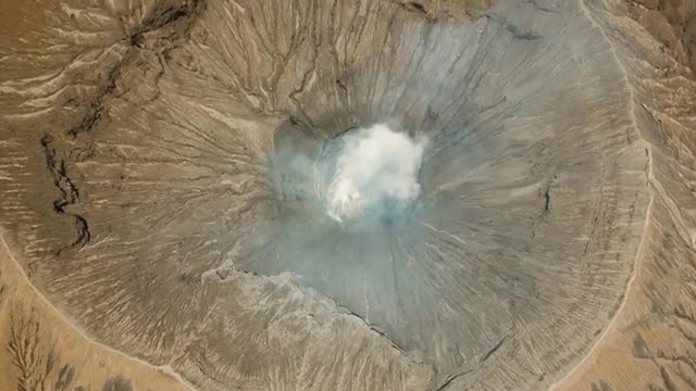 A slow aerial drive to Bromo until crater on right side. Stop - then continue to crater