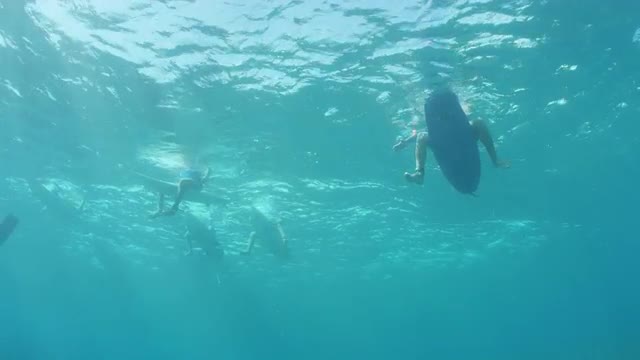 Particles float across surface of water as surfers avoid each other riding down line in Indonesia